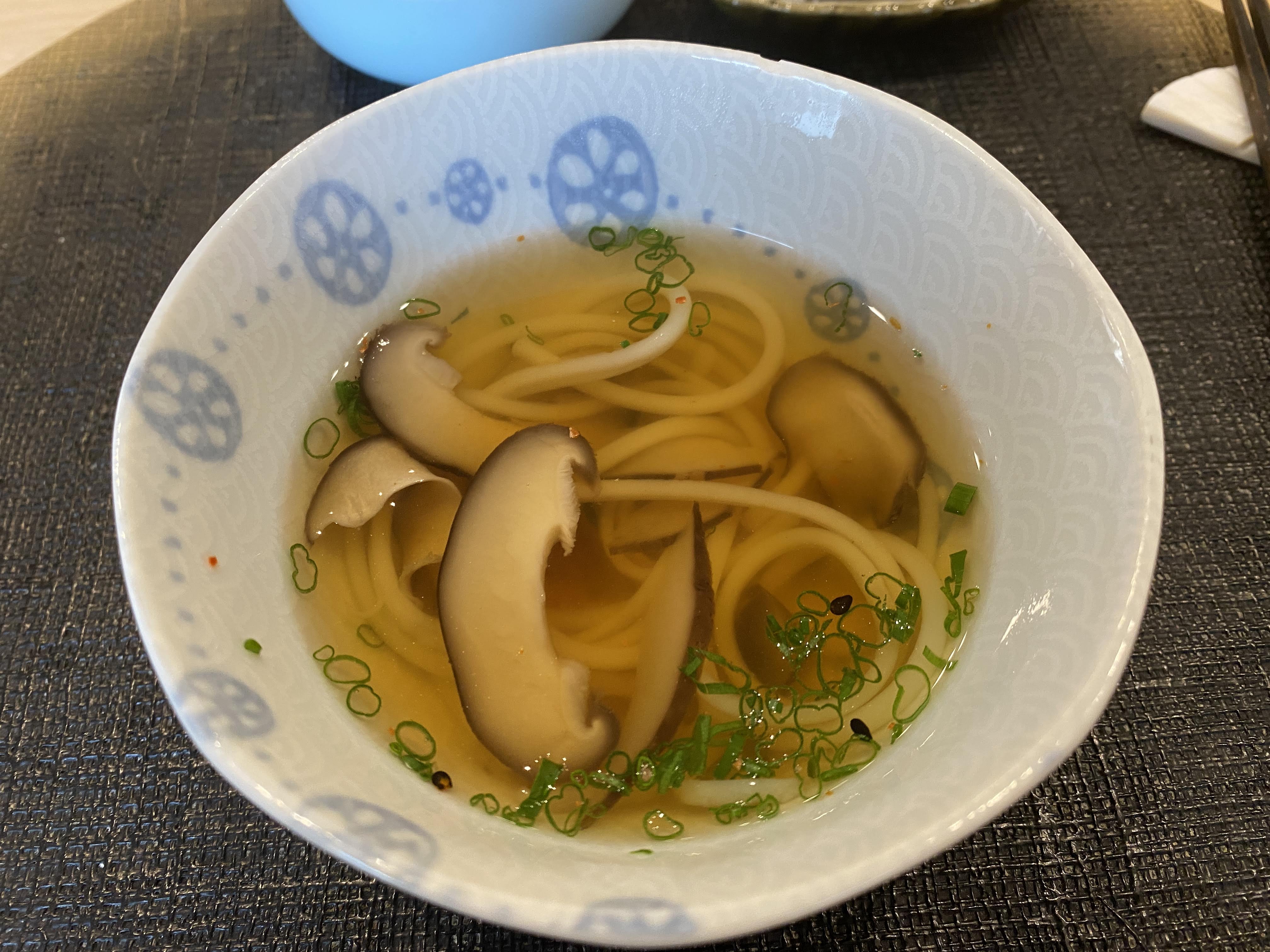 식사로 나온 우동. 면발이 일반 우동보다 훨씬 가늘다. 이렇게 가는 면으로도 우동을 하는구나 싶어서 신기했다. 국물 맛은 크게 진하진 않고 그냥 먹을 만은 하다.