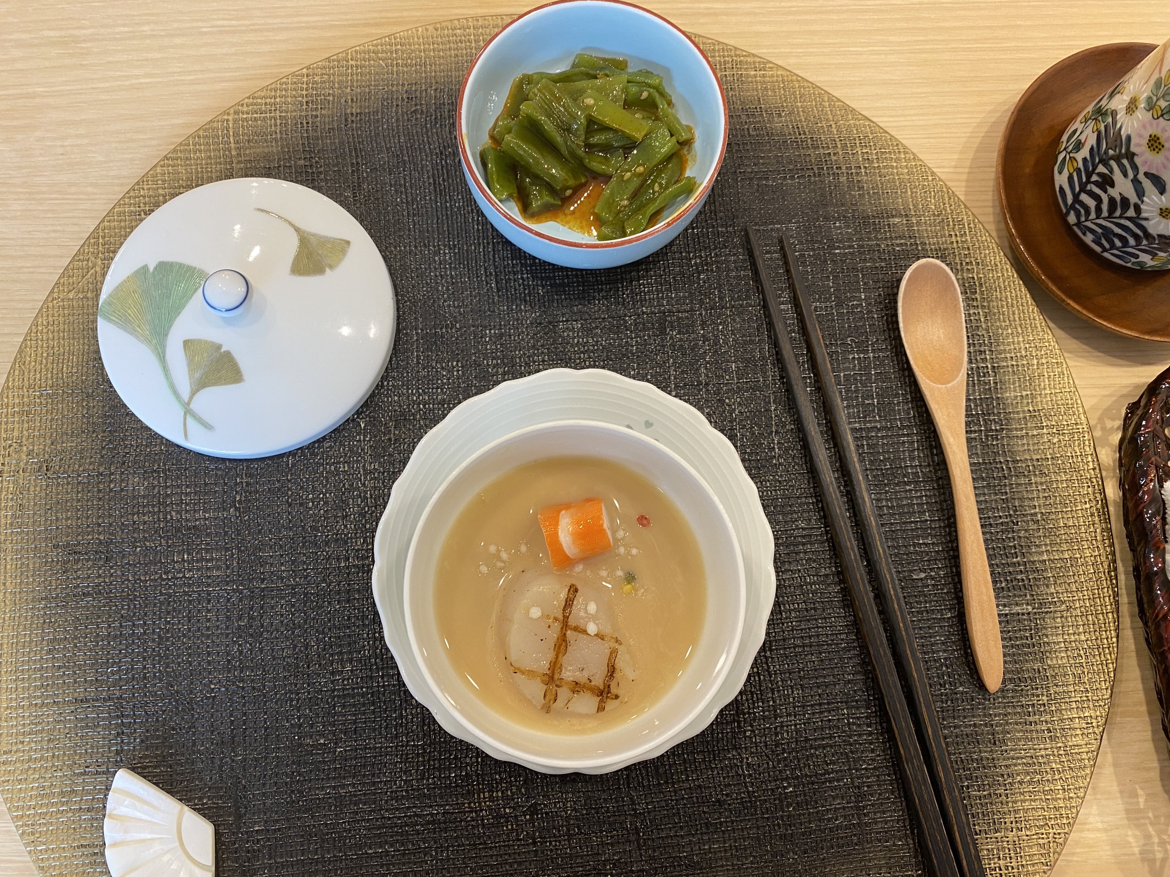 두 번째는 달걀찜이 나왔다. 촉촉하고 매끄러운 식감의 달걀찜에 은행, 관자, 새우살이 들었다. 옆에 나무 숟가락은 계란찜 전용! 이거 먹고 나니 가져가셨다.