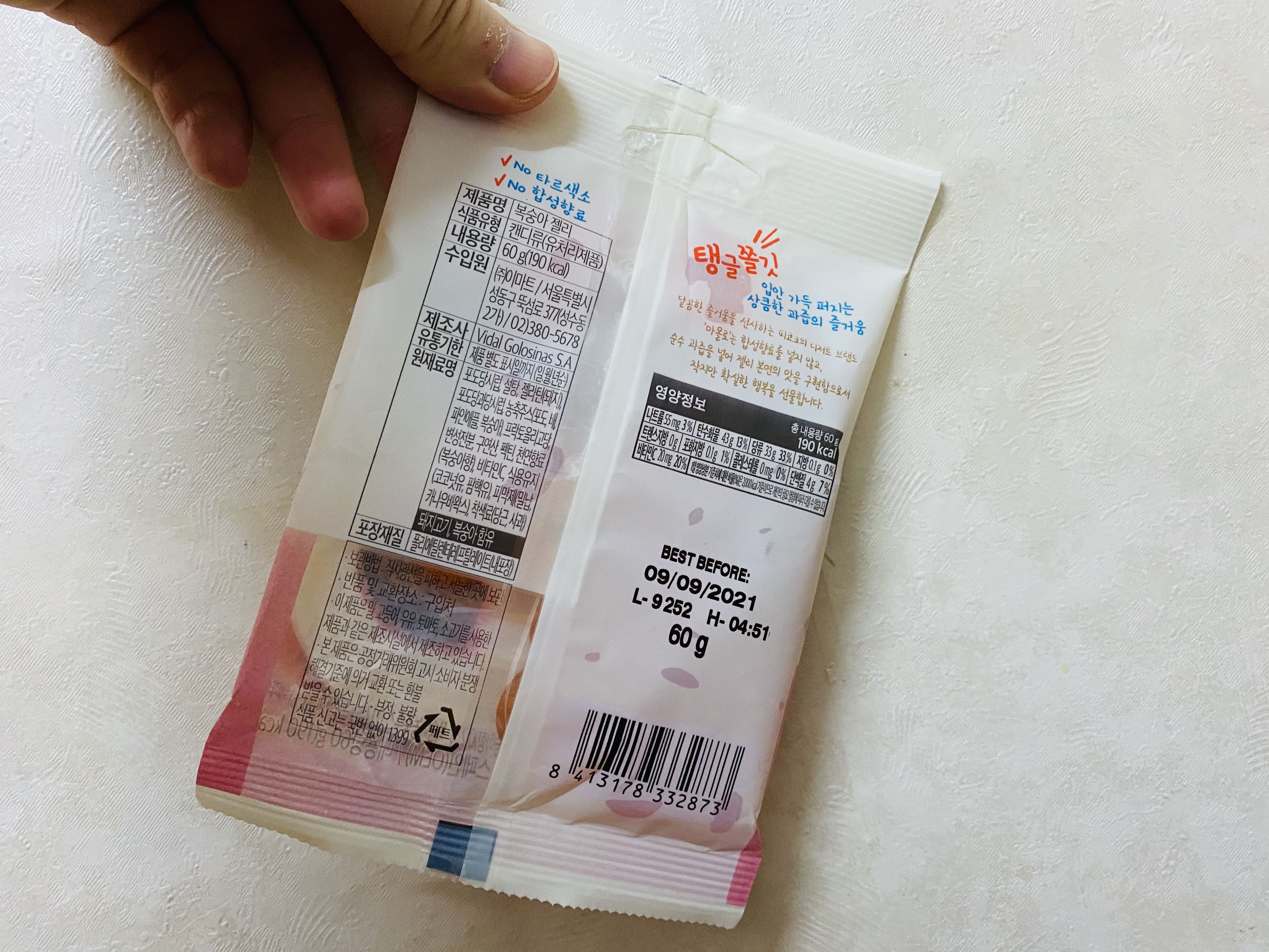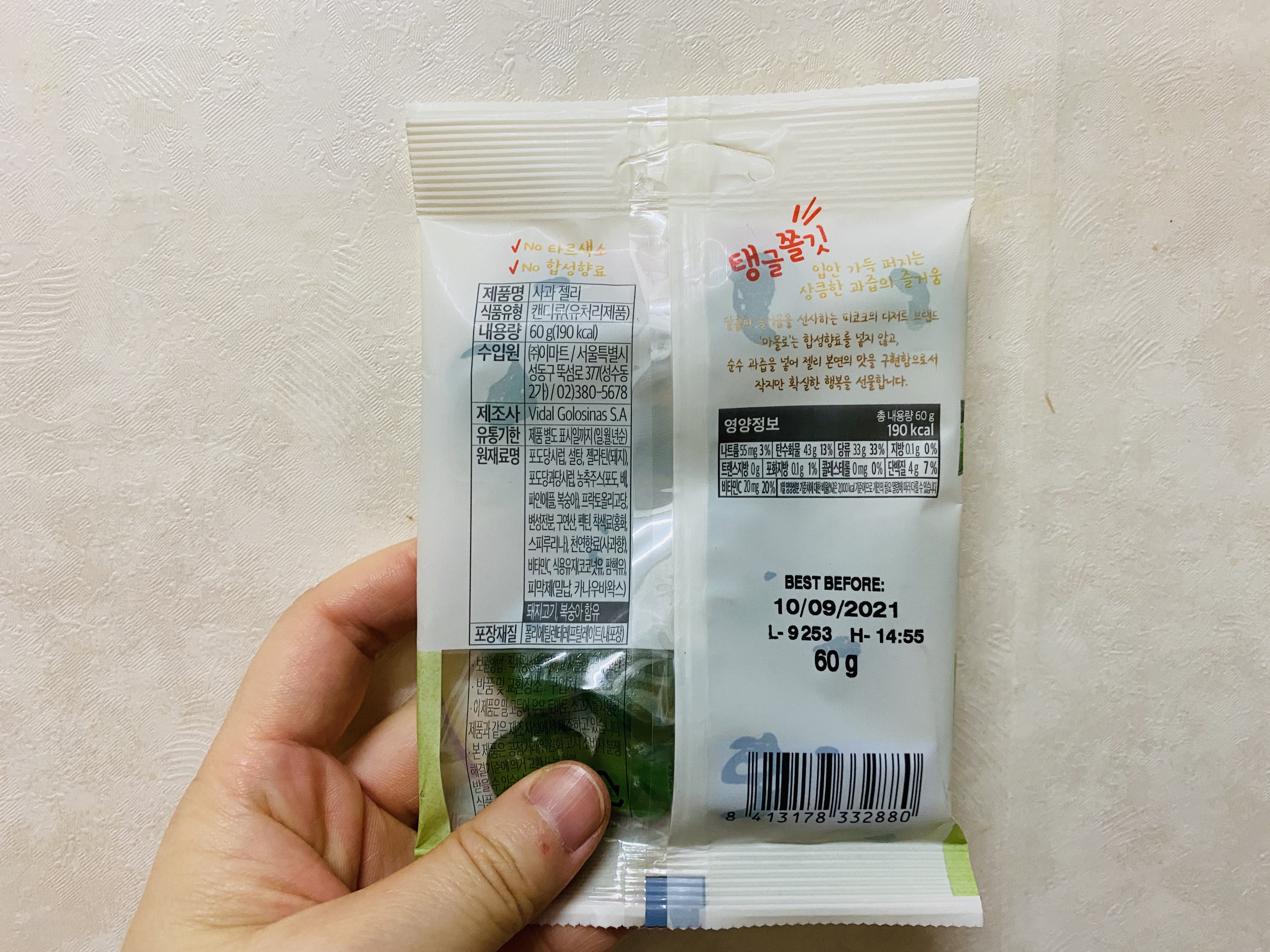 뒷면의 칼로리와 영양 정보. 젤리는 맛만 있으면 돼!