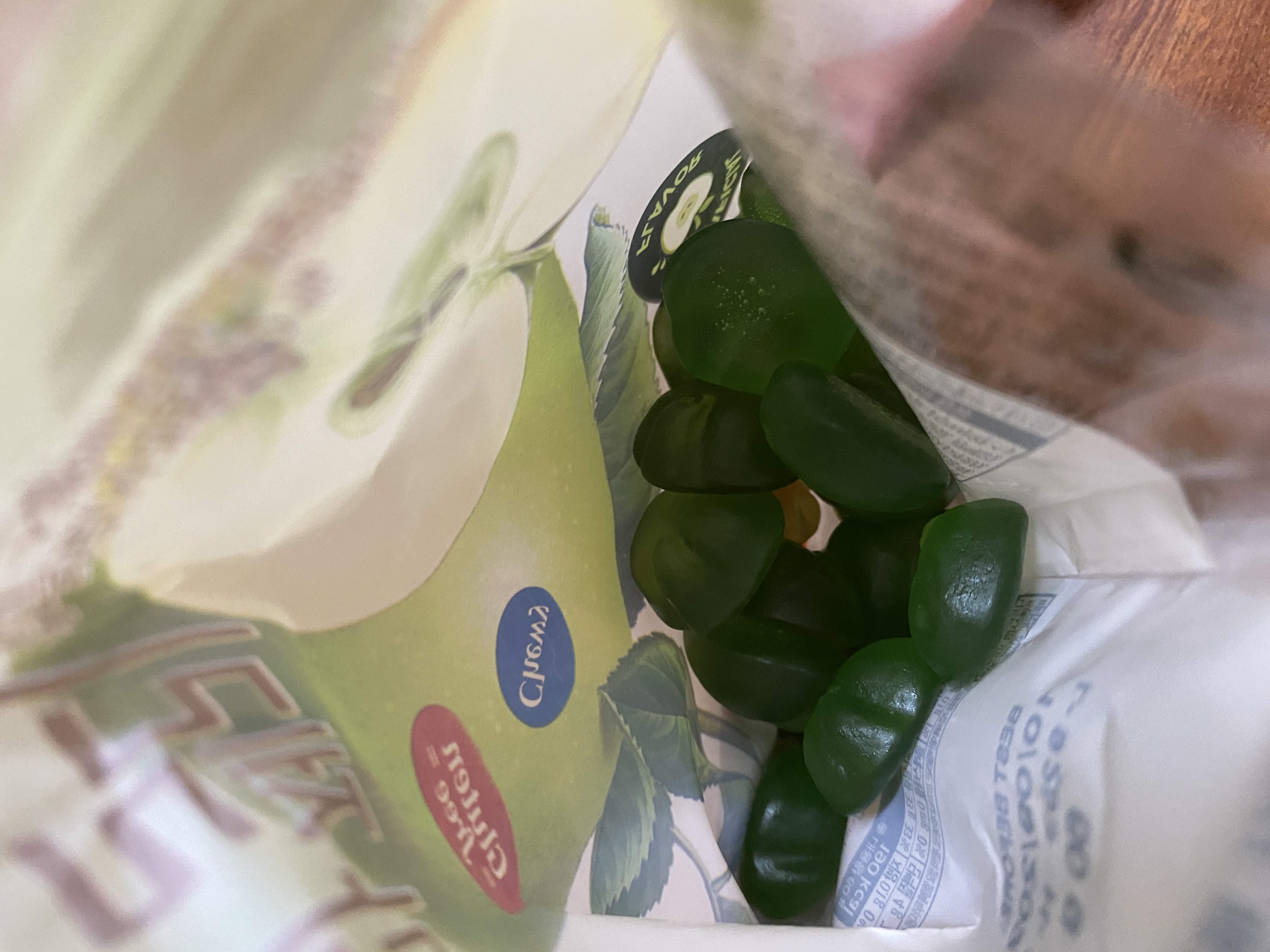 요놈, 얼마나 맛있나 보자. 사과 맛을 뜯었다. 생각보다 색이 진하다. 아마 봉지 안에 들어서 서로 겹쳐 있으니 더 그래 보인 것 같다. 이것은 마치 쑥색.