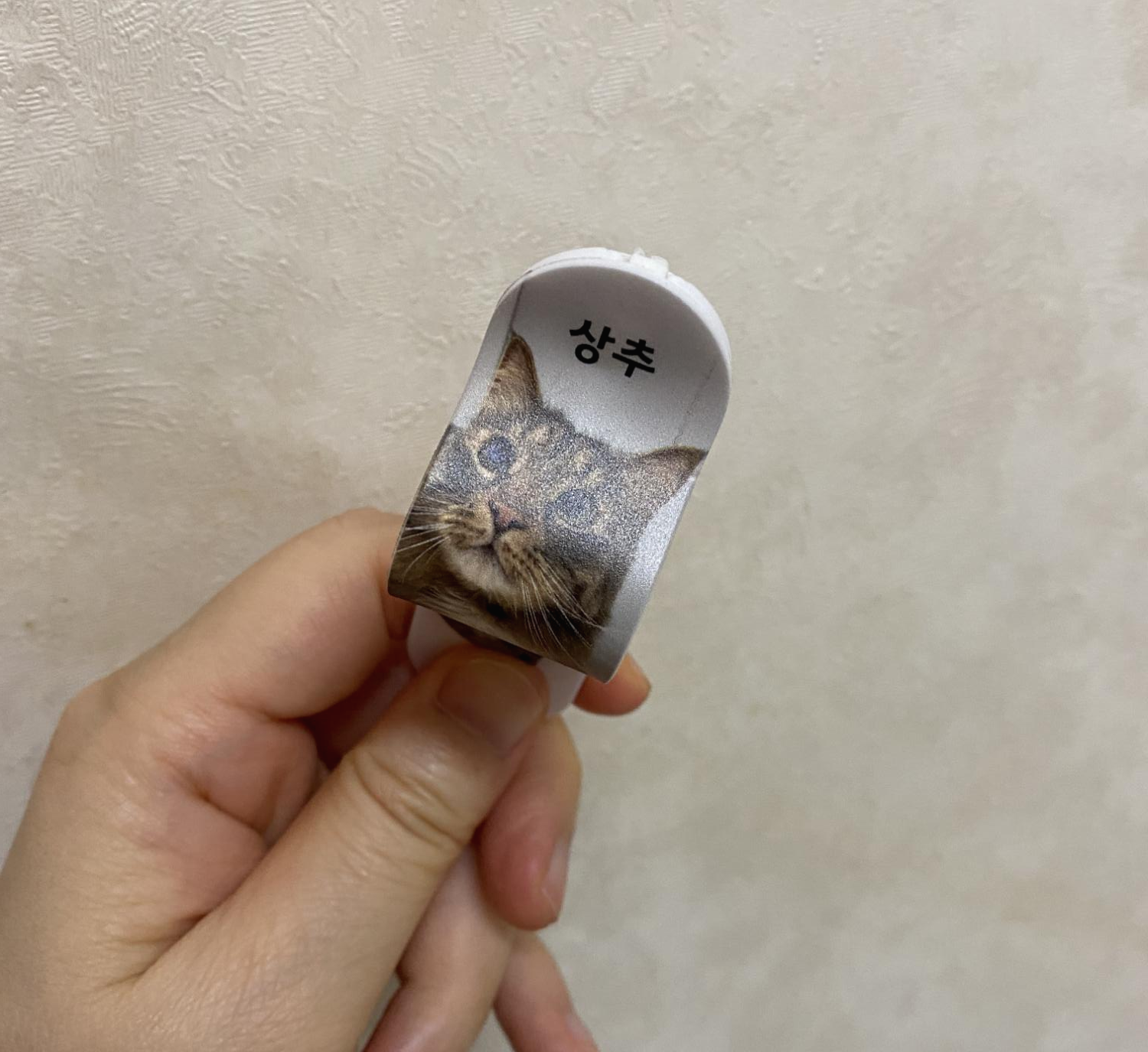 인쇄면 재질이 약간 독특한데 겉이 아주 살짝 오돌도돌해서 쉽게 벗겨지거나 오염되진 않을 거 같다. 크기는 일반적인 모모스틱이랑 똑같다. 언제나 우리 고양이 양반의 귀여운 모습을 볼 수 있어서 마음에 든다.