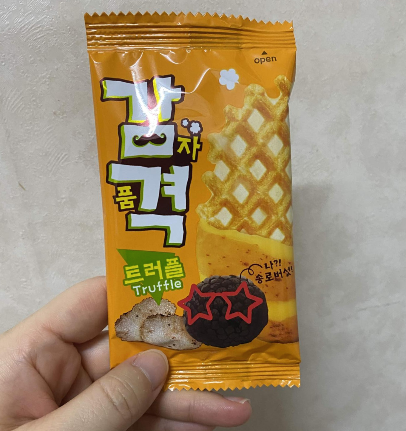 그럼 상자 다 먹어 봐야 얇고 바삭한 감자 과자 12개뿐이구나. 맛은 바삭하고 고소하면서 감자 풍미가 잘 난다. 감자 향이 아닌 다른 향이 슬며시 오르는데 이게 아마 트러플 향인 것 같다. 트러플이란 이런 향이구나.