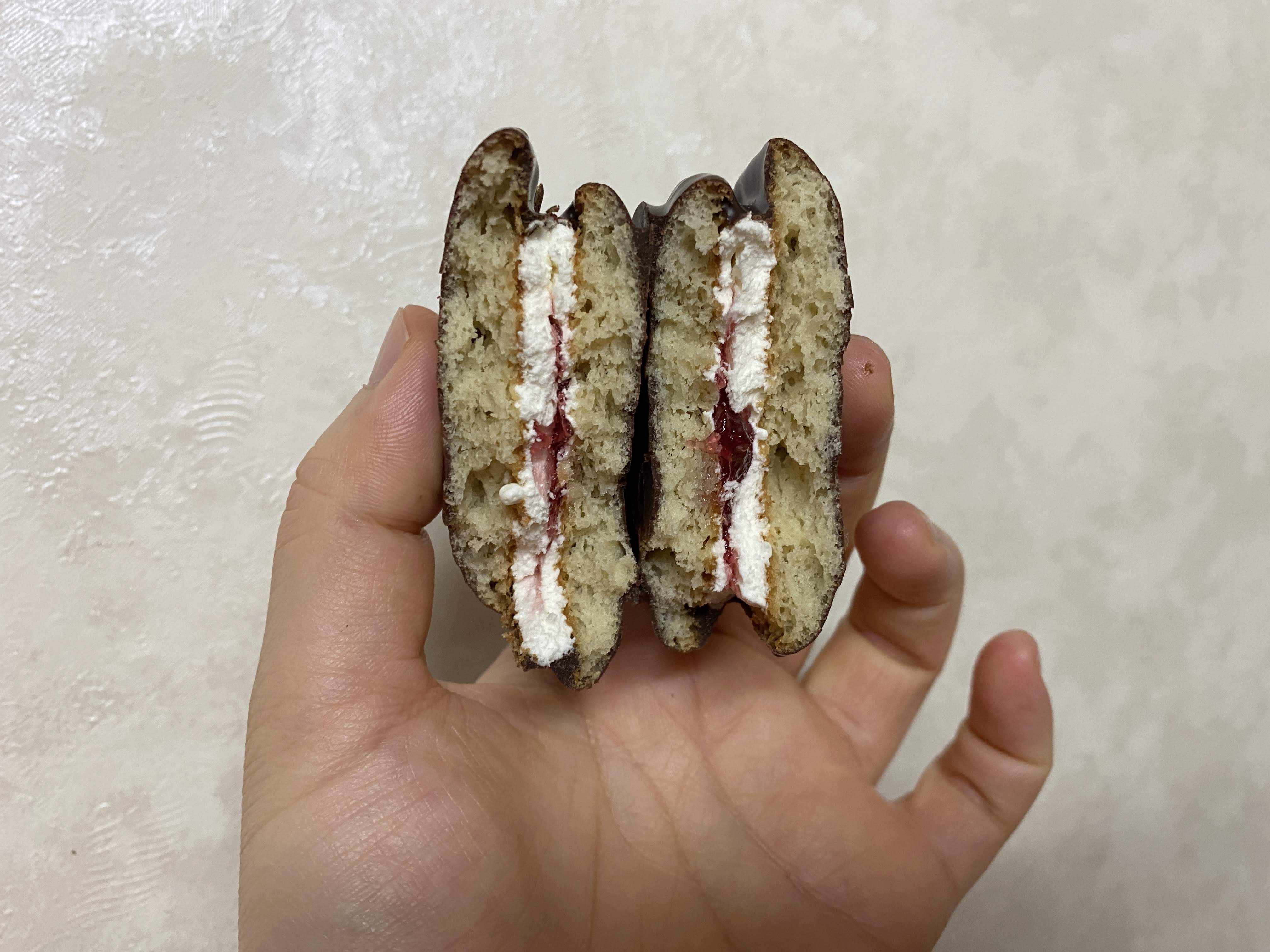 몽쉘 특유의 촉촉한 빵과 크림, 그리고 크림 사이에 든 딸기쨈이 잘 어울린다. 딸기쨈 부분은 크게 달지 않아서 딸기향과 맛을 몽쉘에 얹어 주는 듯하다.
