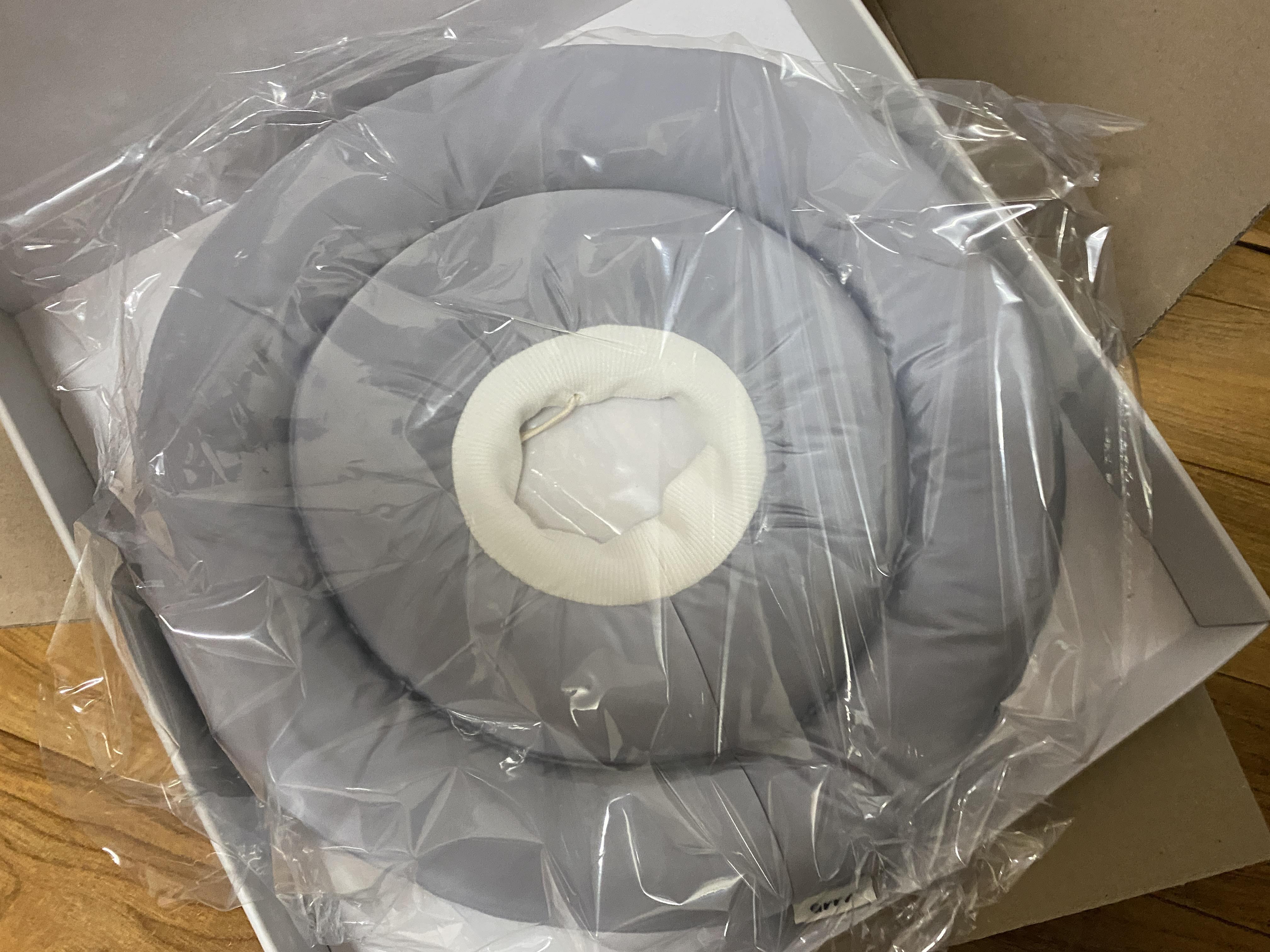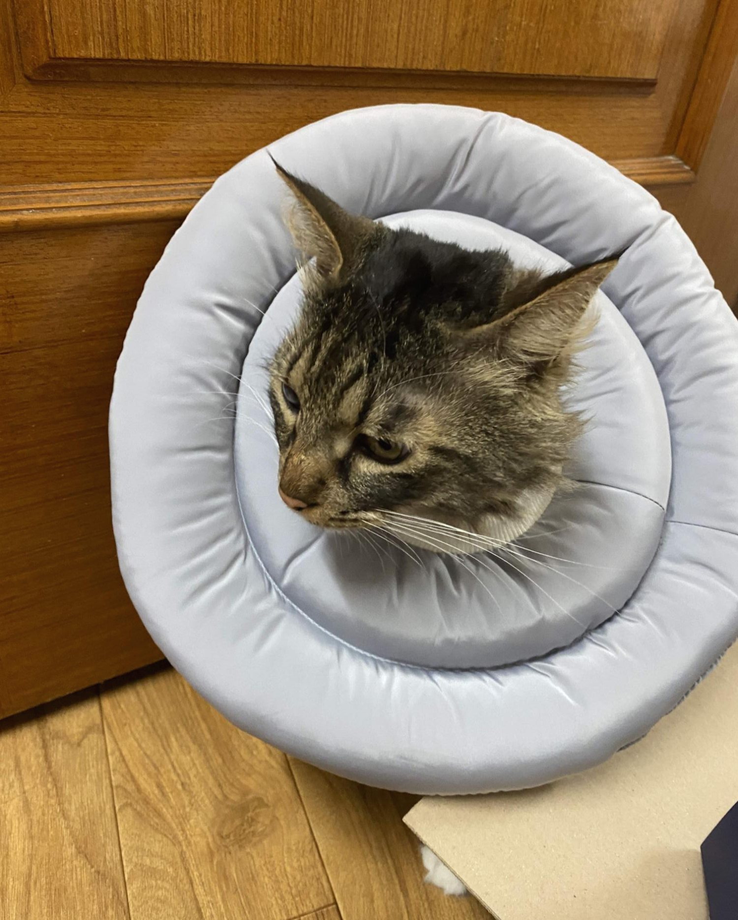 이번에는 회색으로 샀다. 사이즈는 L. 우리 고양이는 7.3킬로그램이 나가는 투실한 고양이므로 L을 산다. 그리고 오버그루밍 범위가 아랫배와 허벅지 안쪽이라서 카라가 폭이 넓어야 했다. 이렇게 넓은 걸 씌워도 그루밍을 완전히 차단할 수는 없을 만큼 고양이는 유연하다.