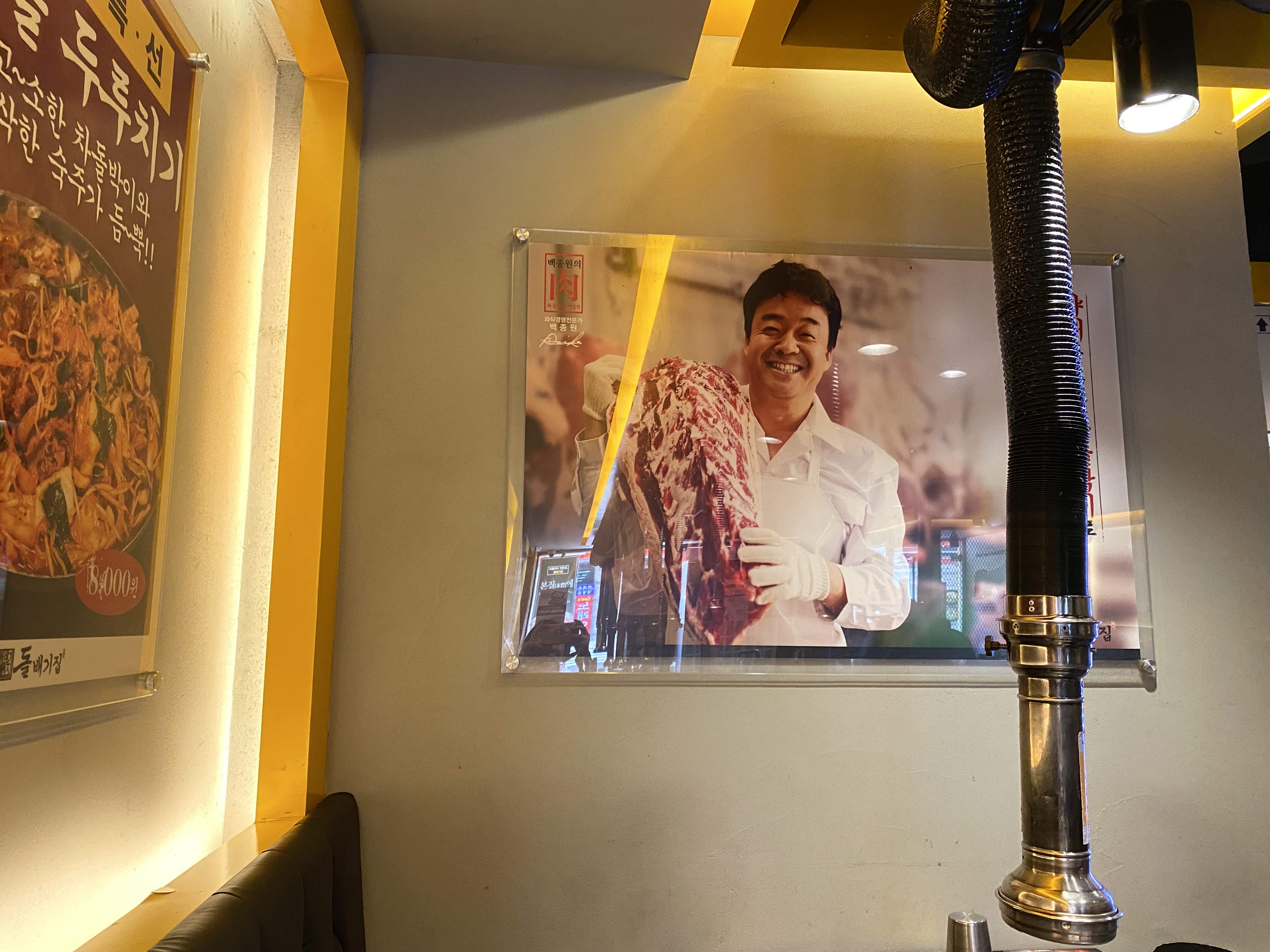 자기 손에 든 큰 고깃덩이를 자랑하는 백종원씨.