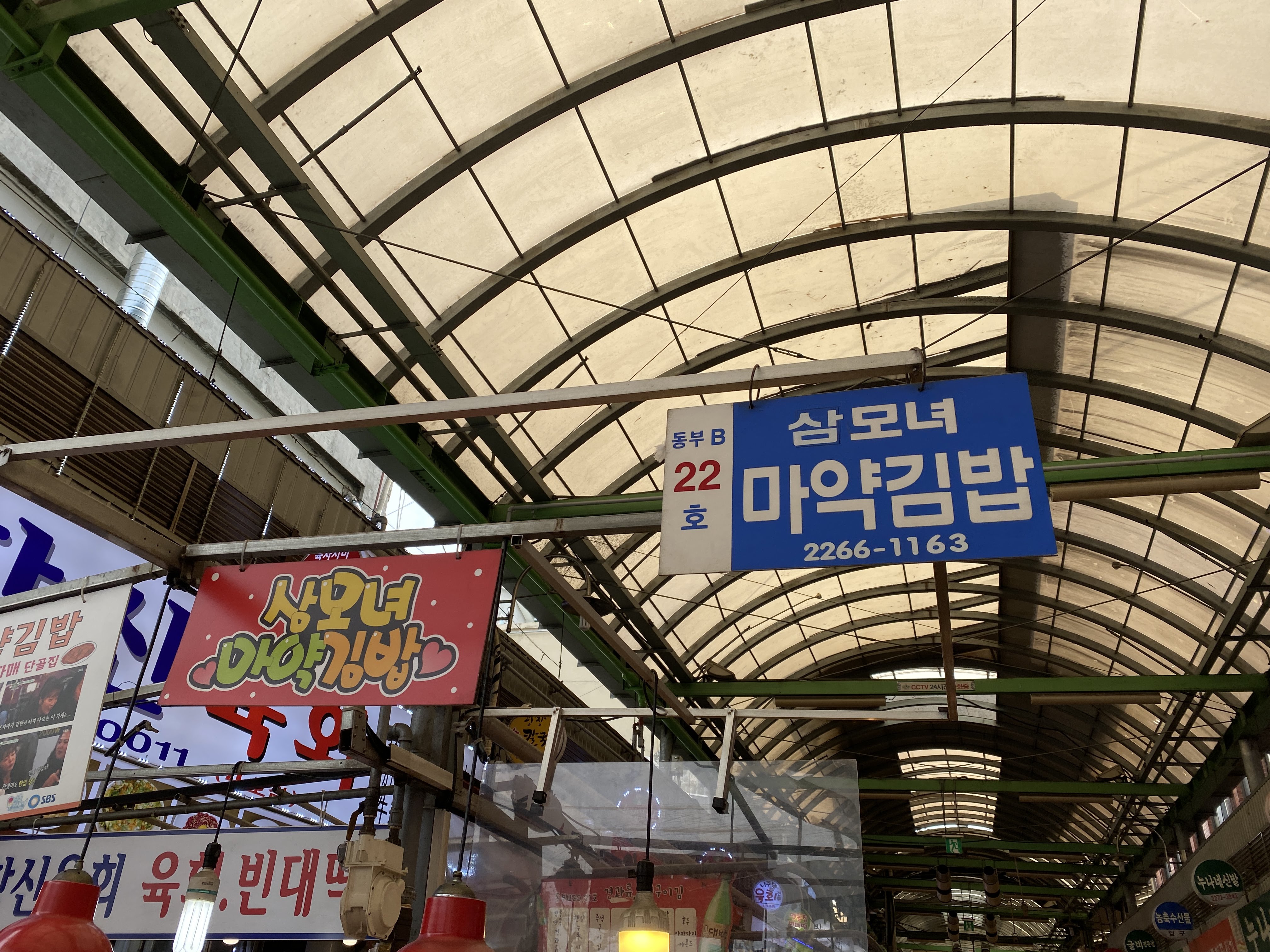 마약김밥 파는 곳이 너무 많아서 어디 가면 좋을까 고민하다가 바로 입구에 홍진영 자매가 갔다고 써 붙어 있는 삼모녀 마약김밥에 갔다.