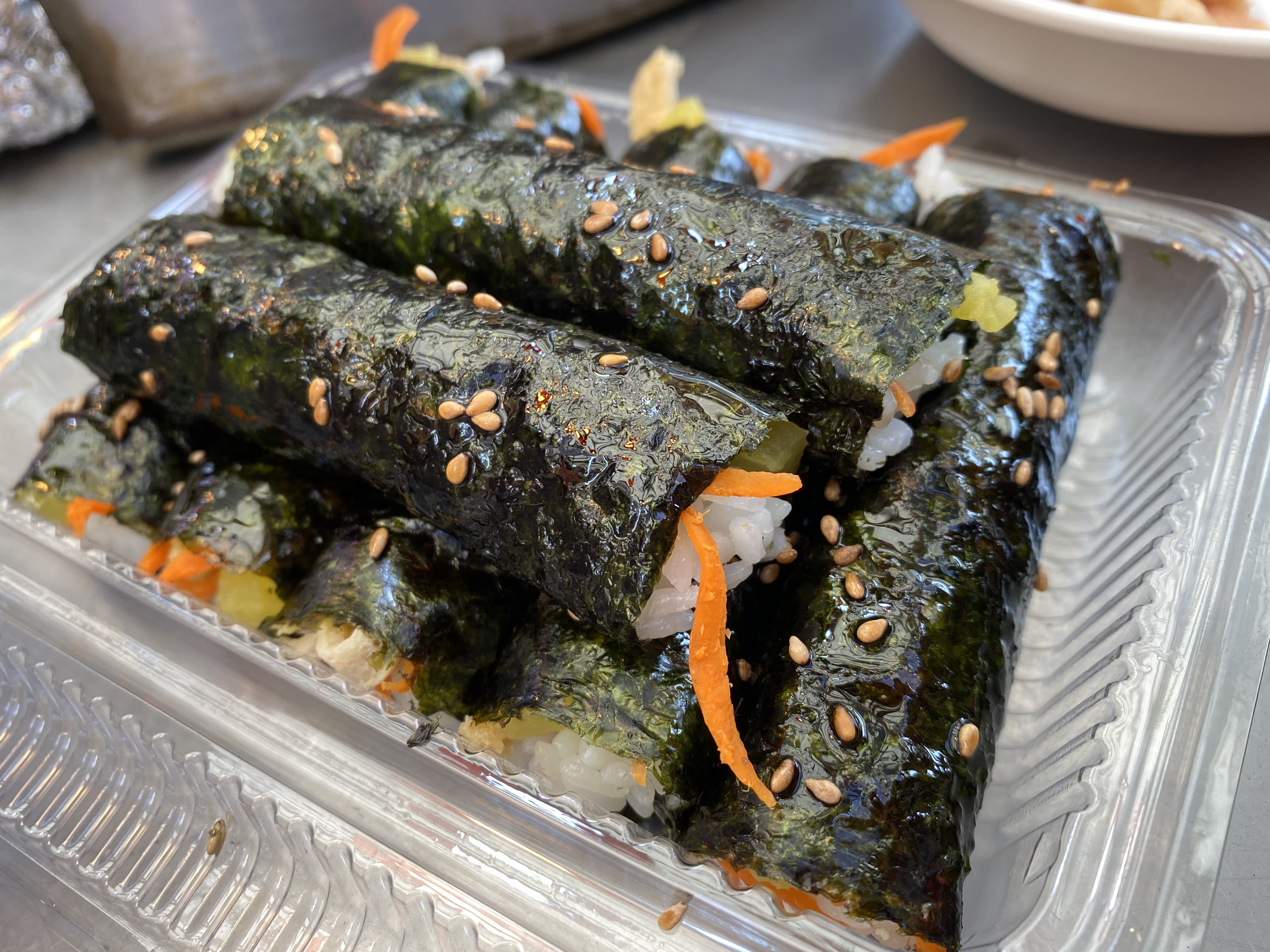 안에는 유부, 당근, 단무지가 든 것 같았는데 조촐한 속재료였지만 겨자 소스와 만나면 특별해진다. 겨자소스는 통이 따로 있는데 이 김밥 통 뚜껑에 따라서 김밥을 찍어 먹으면 된다.