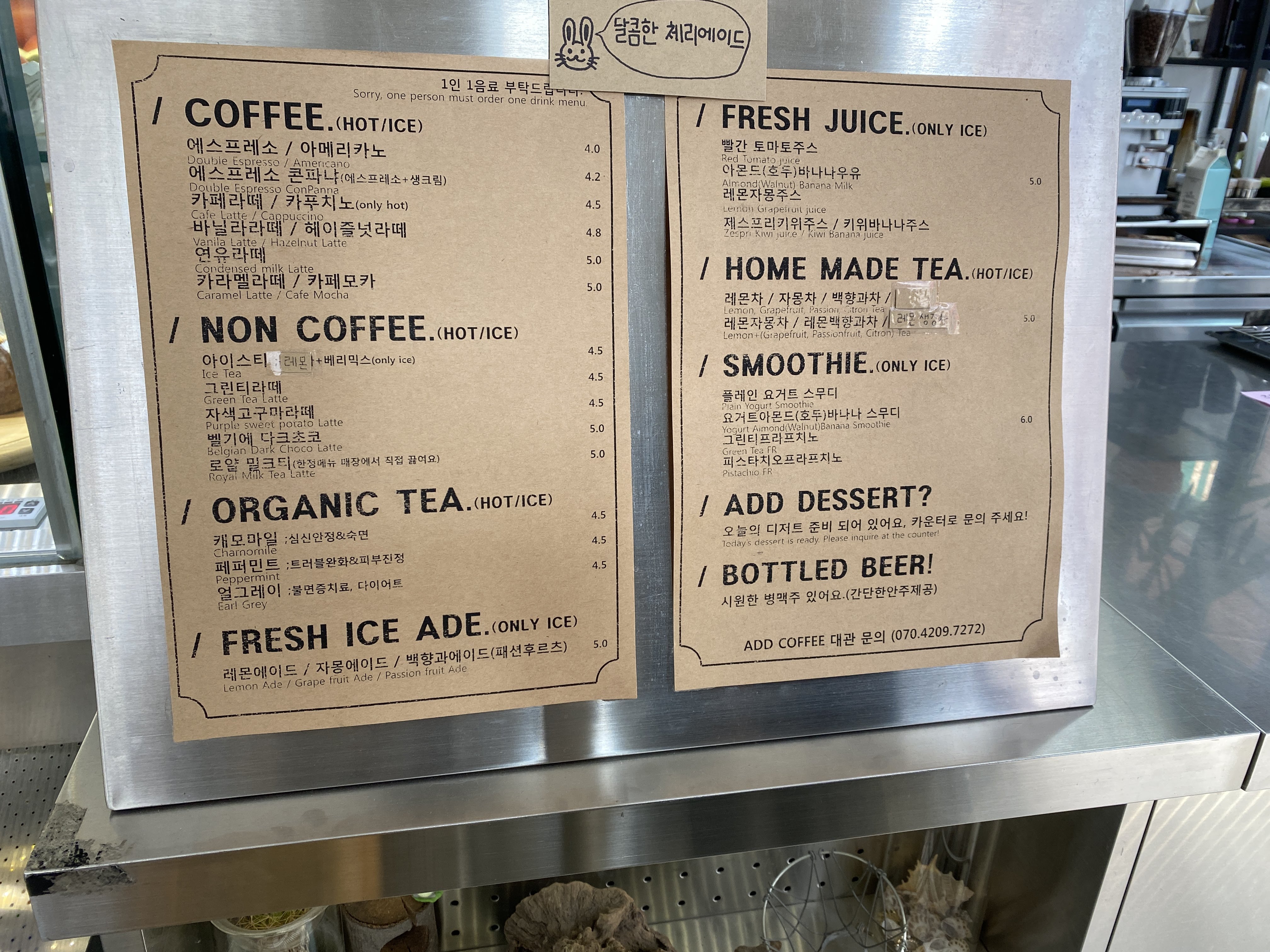 카페 안에는 음료뿐만 아니라 케이크와 빵류도 팔고 있었다. 음료 가격은 이 정도다.