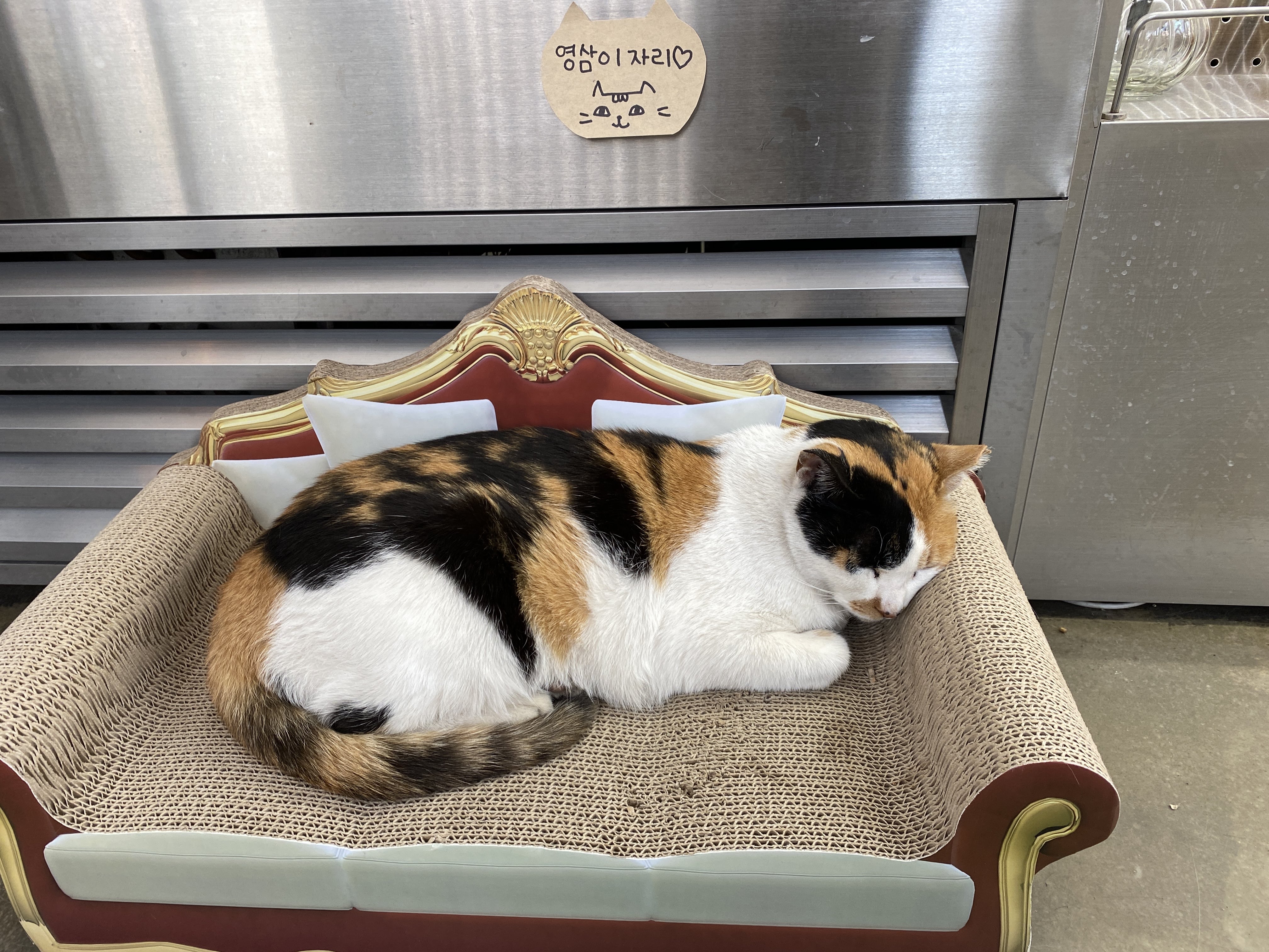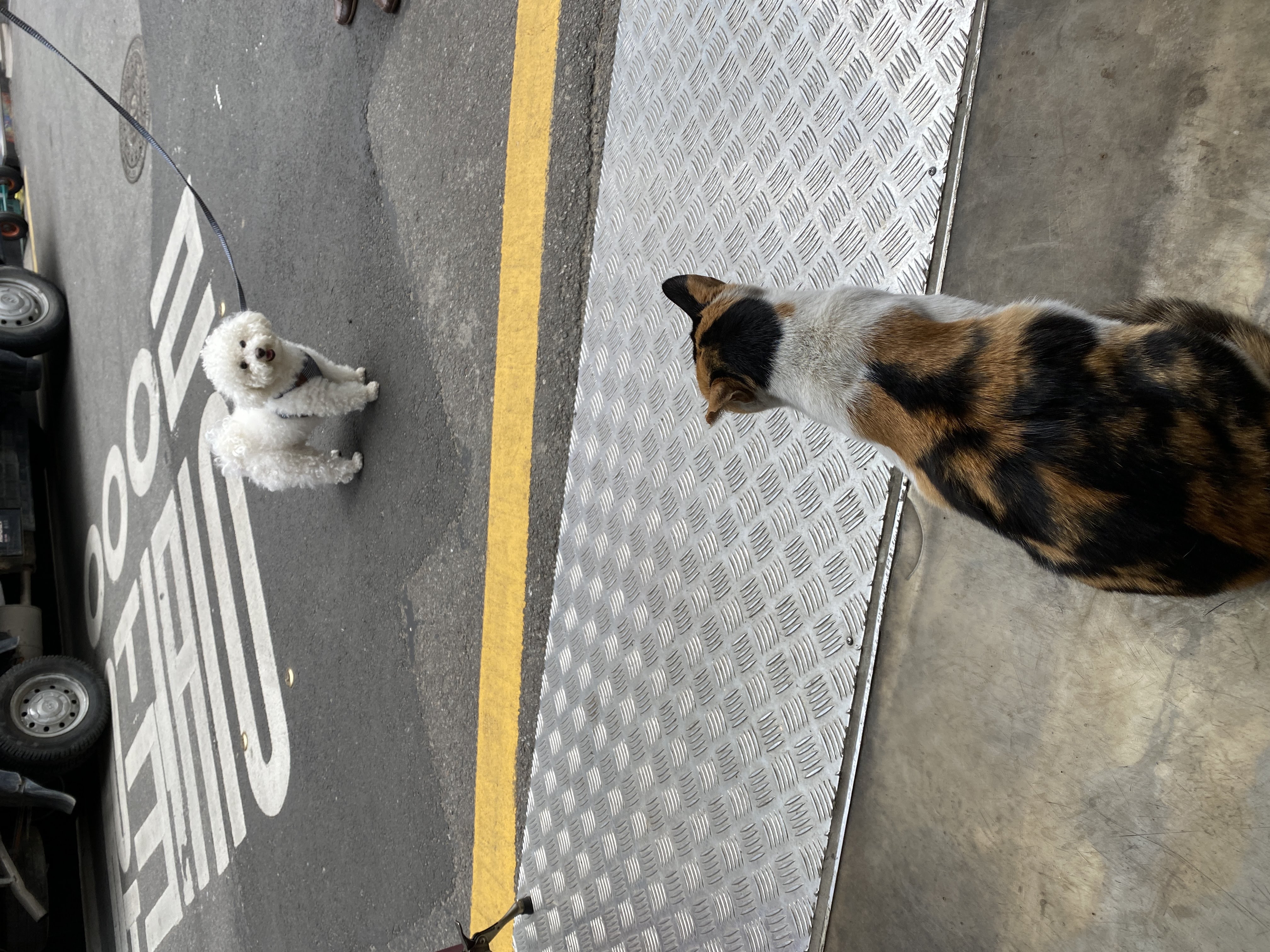 1층에서는 주문만 할 수 있고, 고양이가 한 마리 있다. 지나가던 강아지와 대치 중인 삼색 고양이.