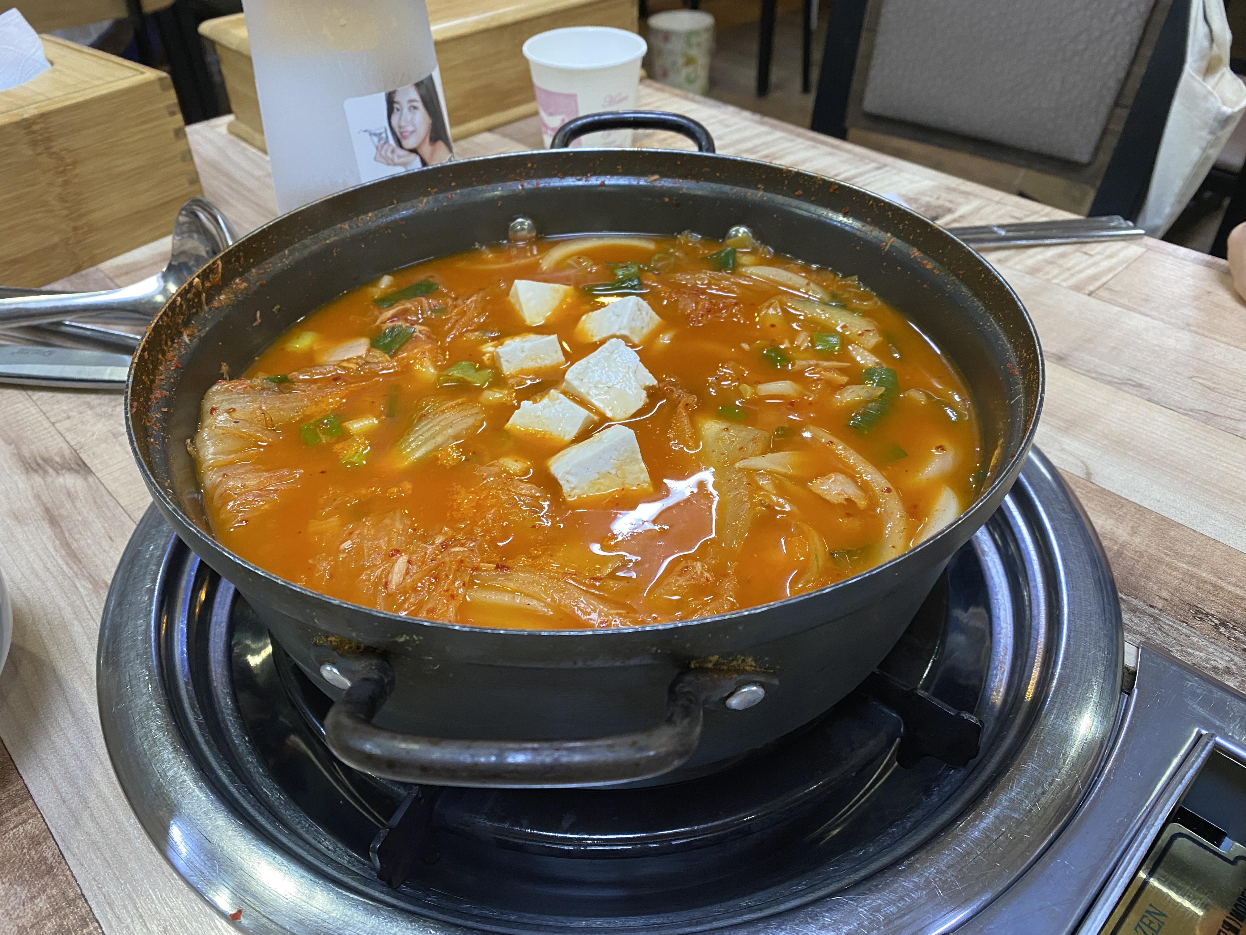이건 참치 김치찌개다. 이건 둘이 먹었는데, 냄비가 어찌나 크던지 결국 좀 남았다. 참치 부스러기가 많아서 국물을 홀홀 마시면 참치 건더기가 딸려 오는 게 좋았다. 김치가 맛있어서 찌개 맛도 개운하니 맛났다.