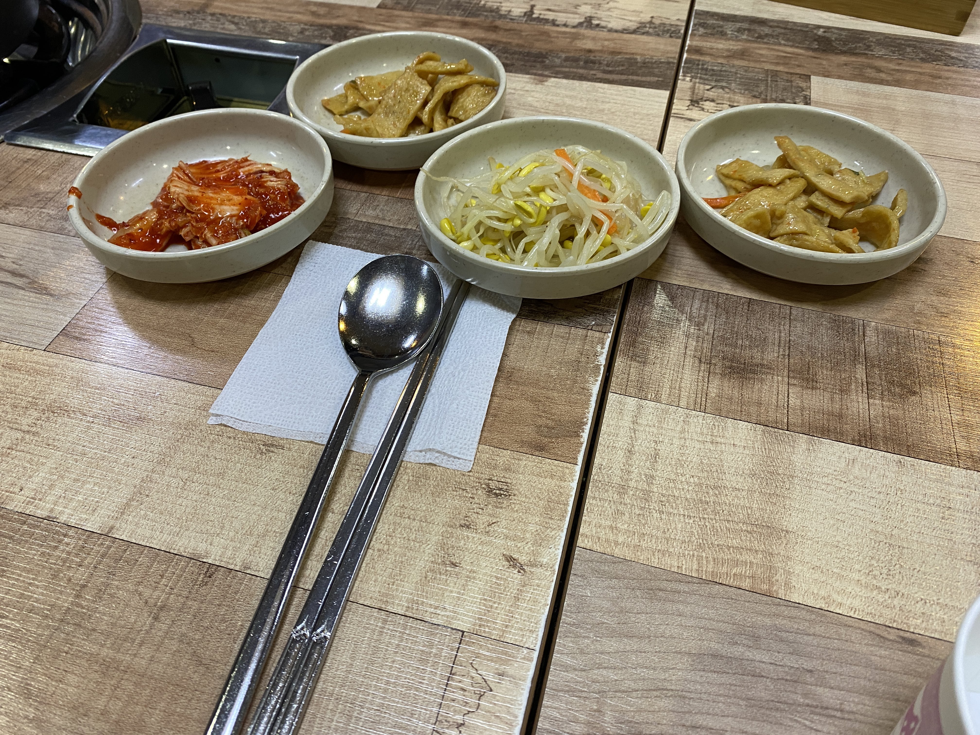 밑반찬. 찬이 빨간 찬이 별로 없는 걸 보니 찌개나 닭볶음탕이 적당히 자극적일 모양이다.