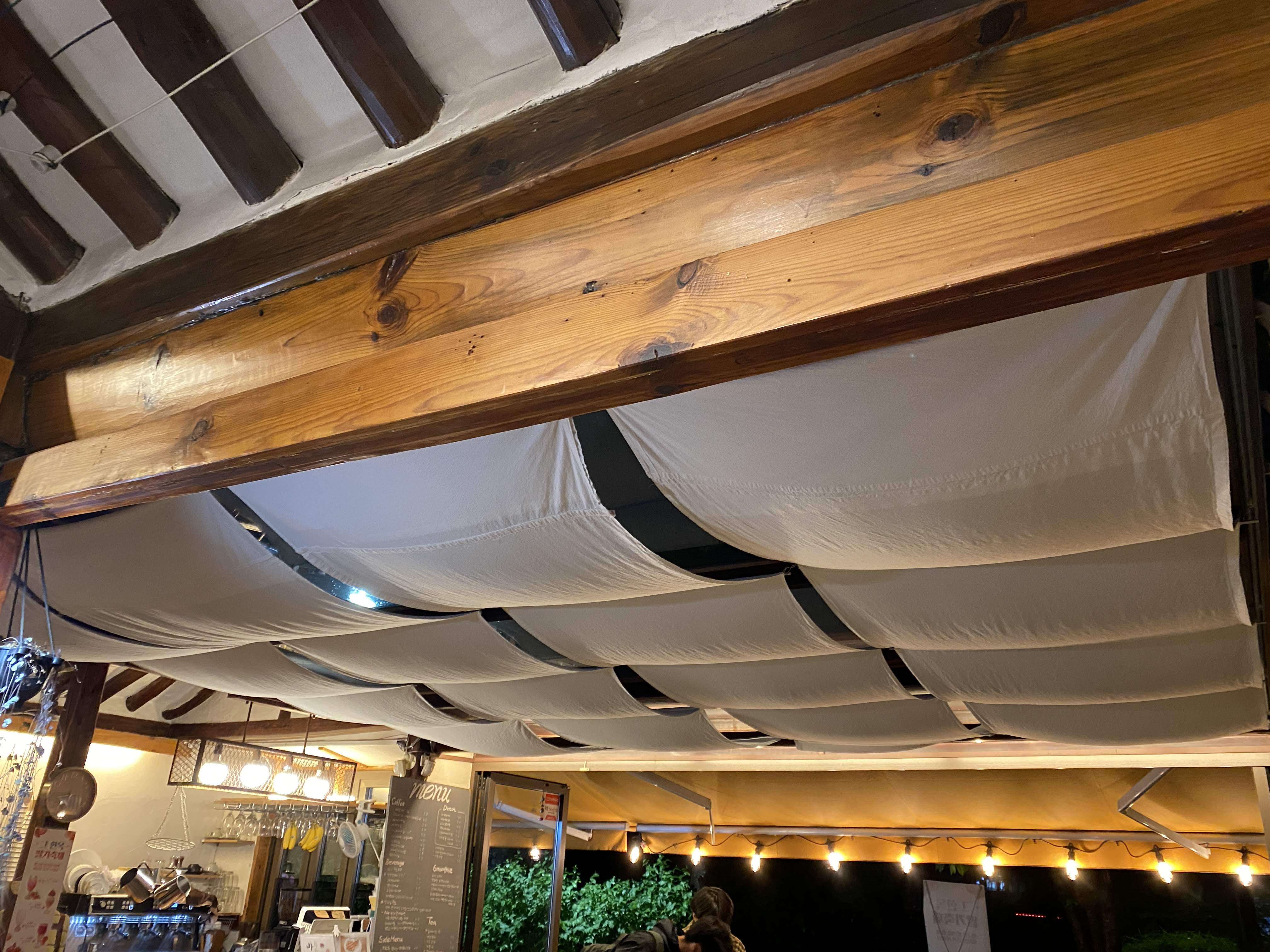 천장이 특이했다. 천을 적당히 늘어뜨려서 장식했는데 꼭 바람맞은 배의 돛 같아서 자꾸 보게 된다.