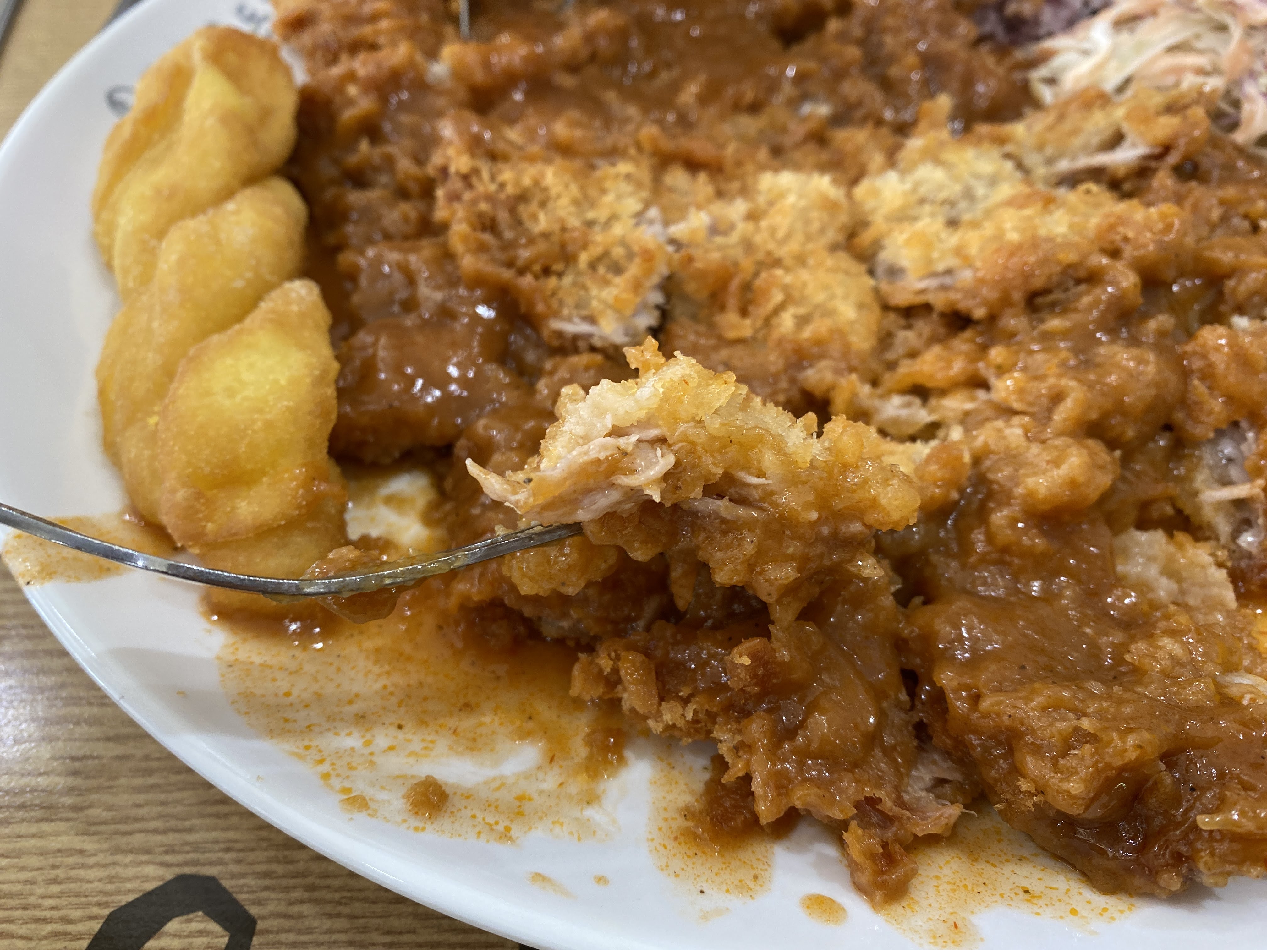 돈까스가 크니까 자르는 것도 노동이다. 여기 돈가스는 고기가 엄청 얇다. 그리고 구석탱이에 보이는 것처럼 꽈배기를 주는 점이 특색인 것 같다. 고기가 얇으니까 튀김옷이 더 많은 것처럼 느껴져서 먹다 보면 좀 빨리 질린다.