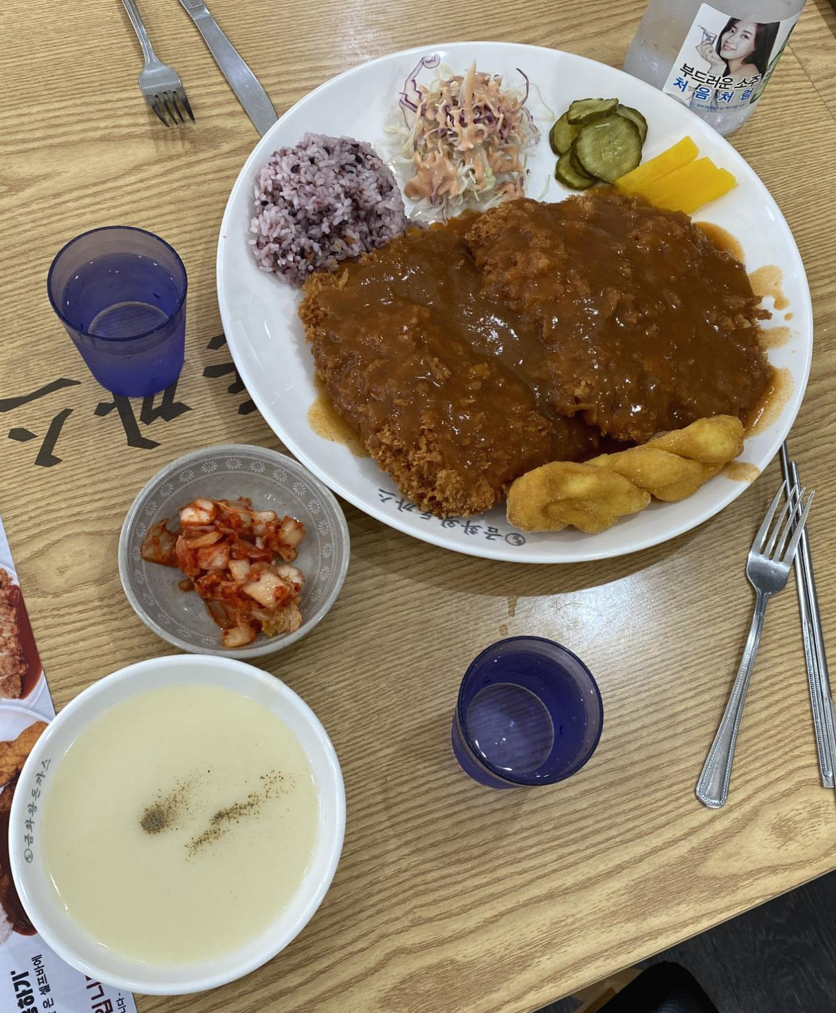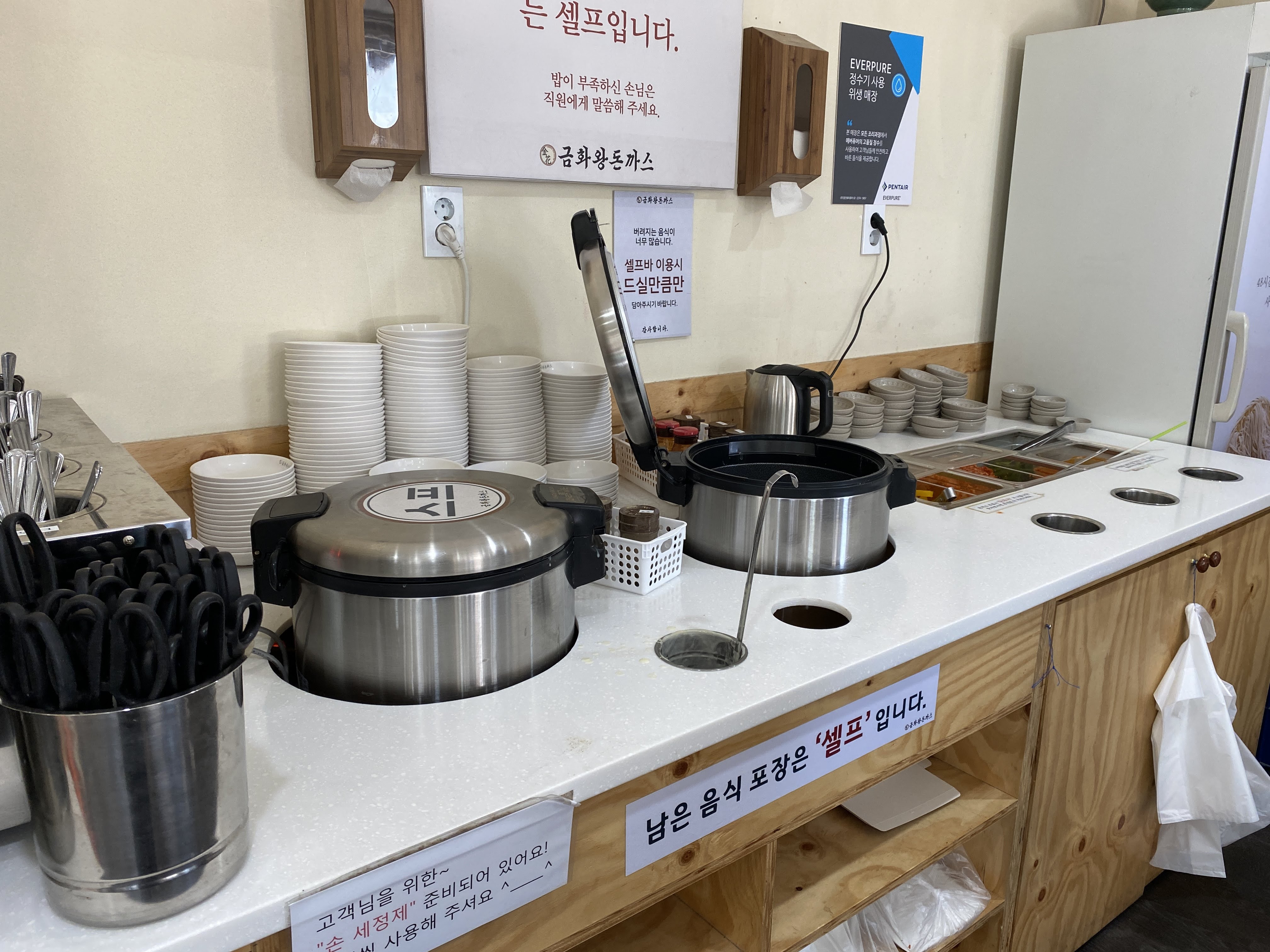 셀프바가 있는데, 수프나 반찬을 가져다 먹을 수 있다. 수프를 양껏 퍼먹을 수 있어서 좋았다. 돈가스 안 시켜도 수프를 먹을 수 있으니까 엄청 장점으로 느껴졌다.