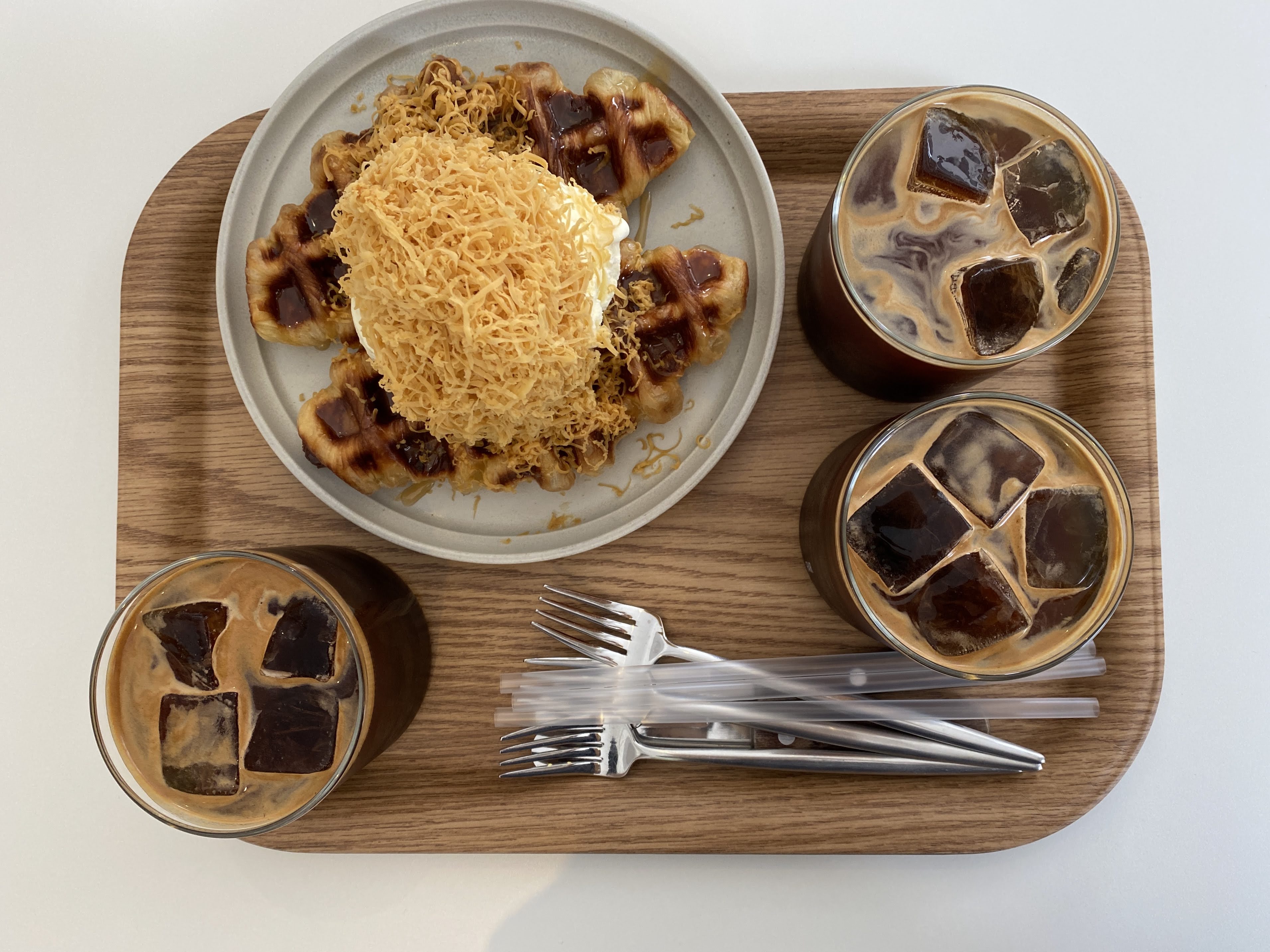 브라운 치즈 크로플크로플 두 조각에 바닐라 아이스크림을 추가했다. 음료는 모두 아이스 아메리카노. 크로플은 바로 구워야 하니까 시간이 좀 걸린다. 음료와 함께 나온 크로플.