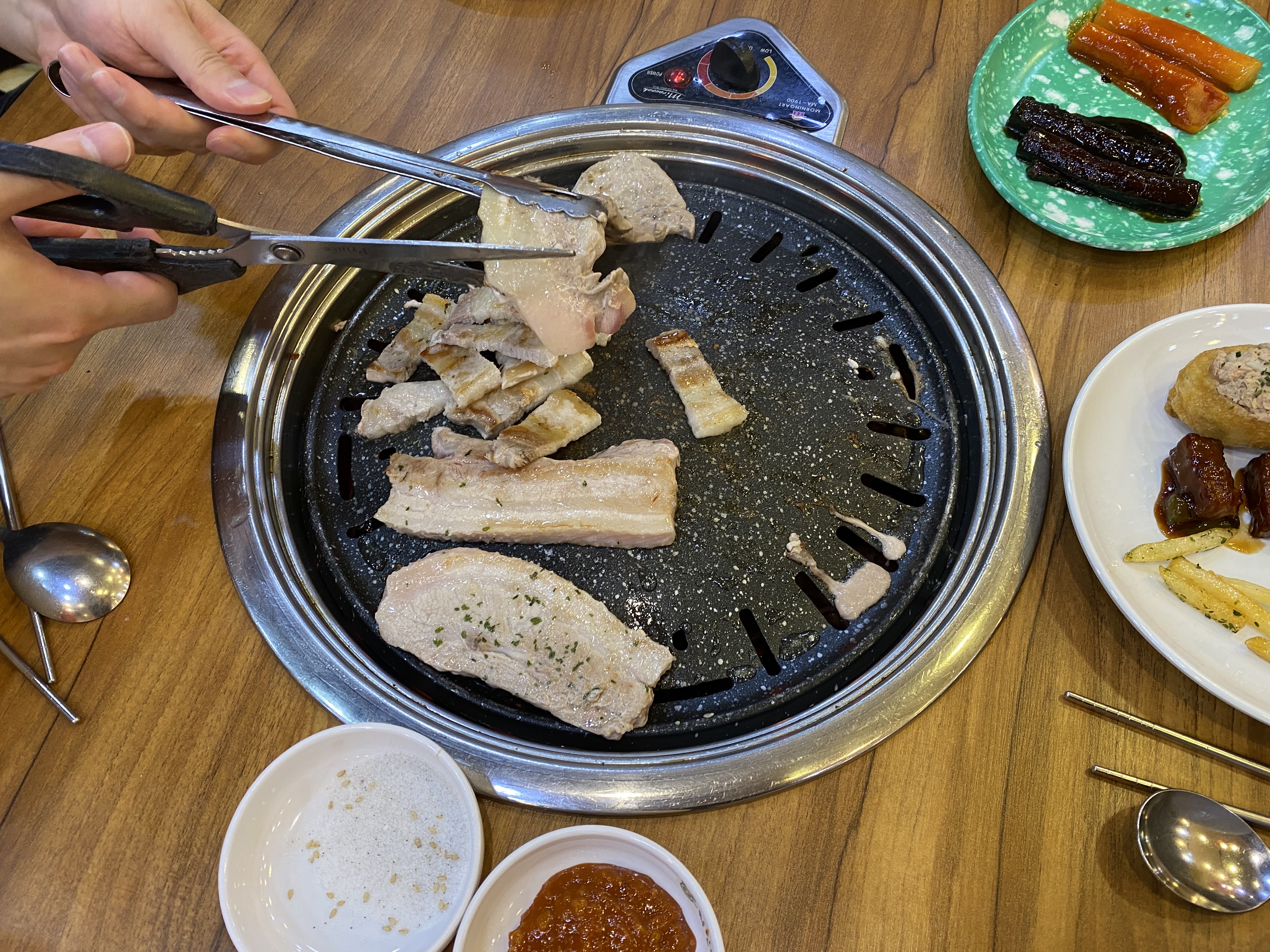 고기는 삼겹살, 양념갈비, 항정살, 소고기, 막창 등등 꽤 다양하게 준비되어 있는데 삼겹살이랑 항정살이 가장 맛있었다. 그래서 삼겹살 위주로 열심히 구워서 먹고 나왔다.