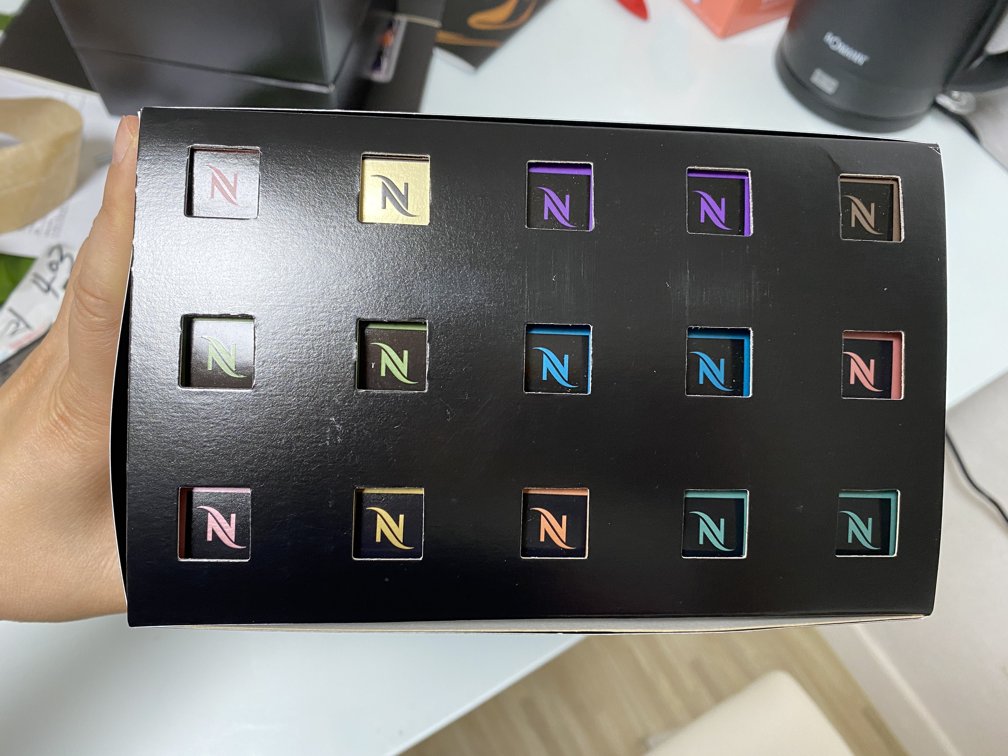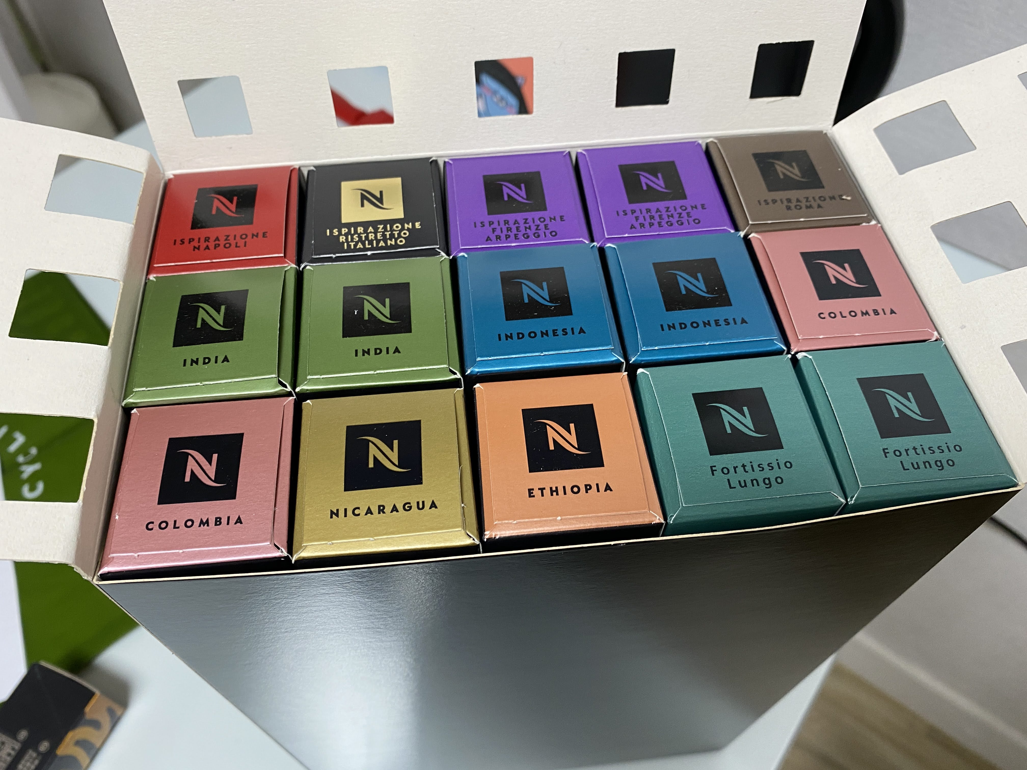 상자 열면 고급스러운 색상으로 이루어진 캡슐커피들이 보인다.