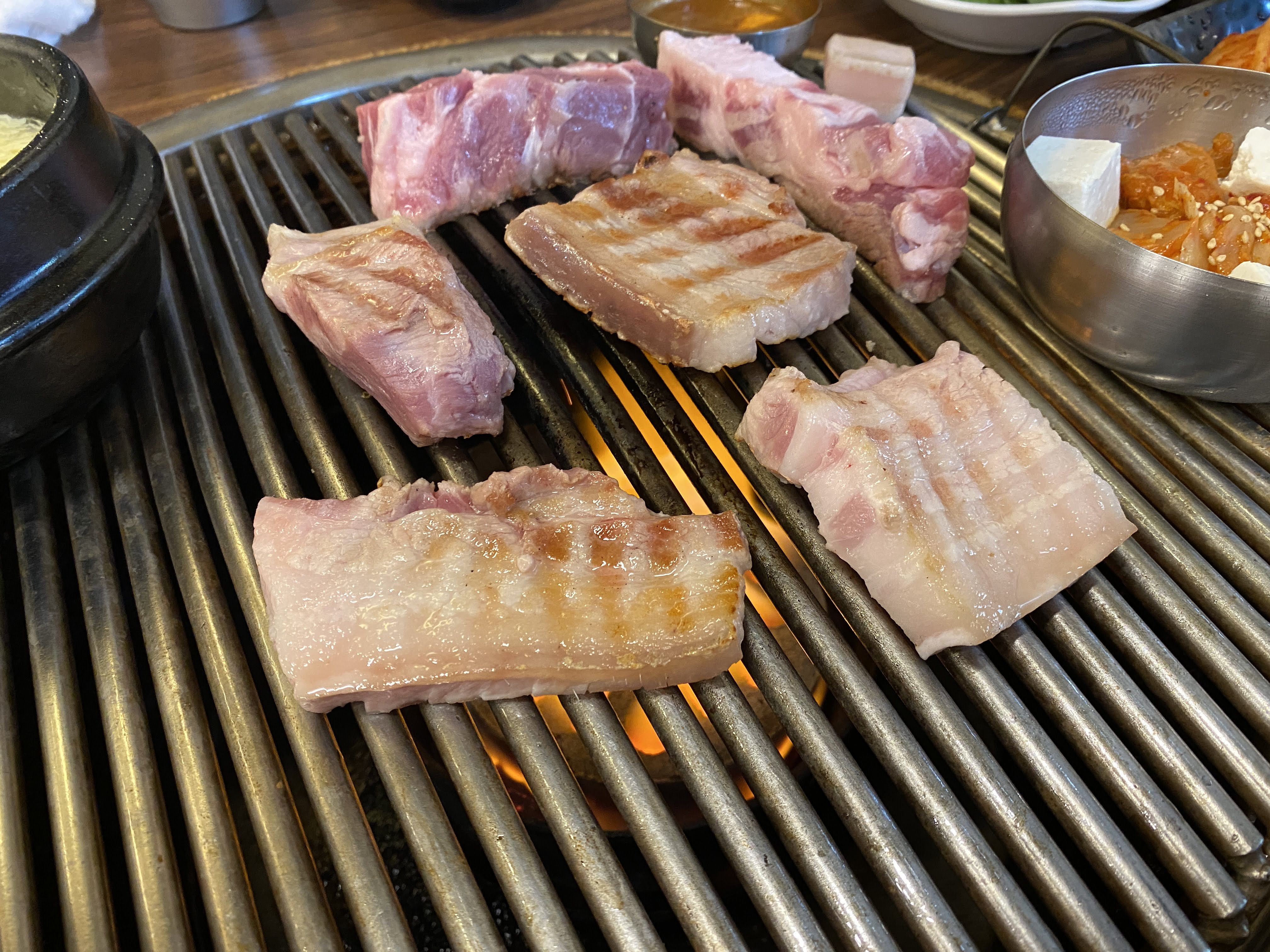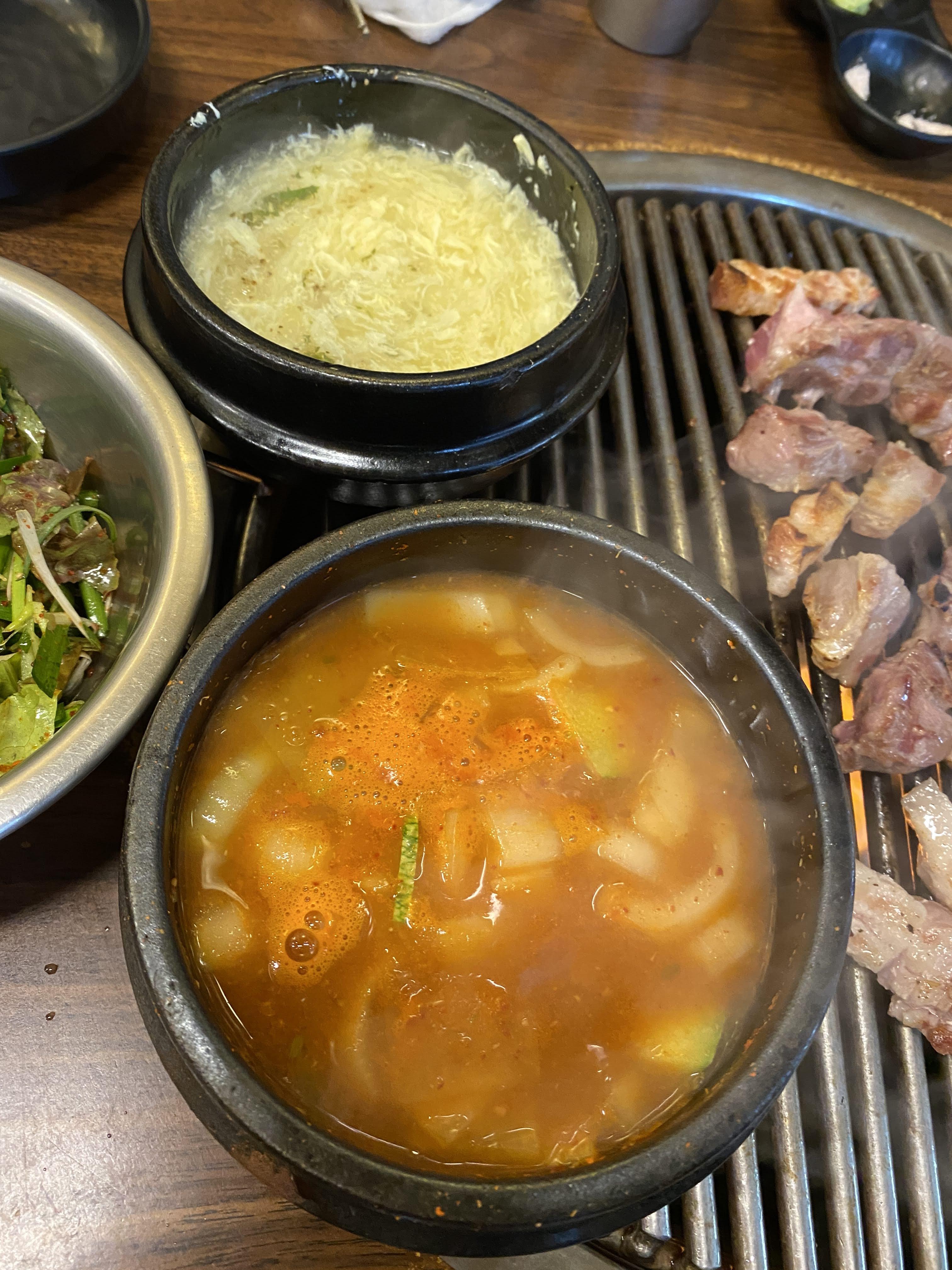 아, 여기 숯이 참 화력이 좋은지 일단 굽기 시작하니까 빠르게 익는다. 계란탕이랑 된장찌개, 멜젓도 불판 위로 올렸다.