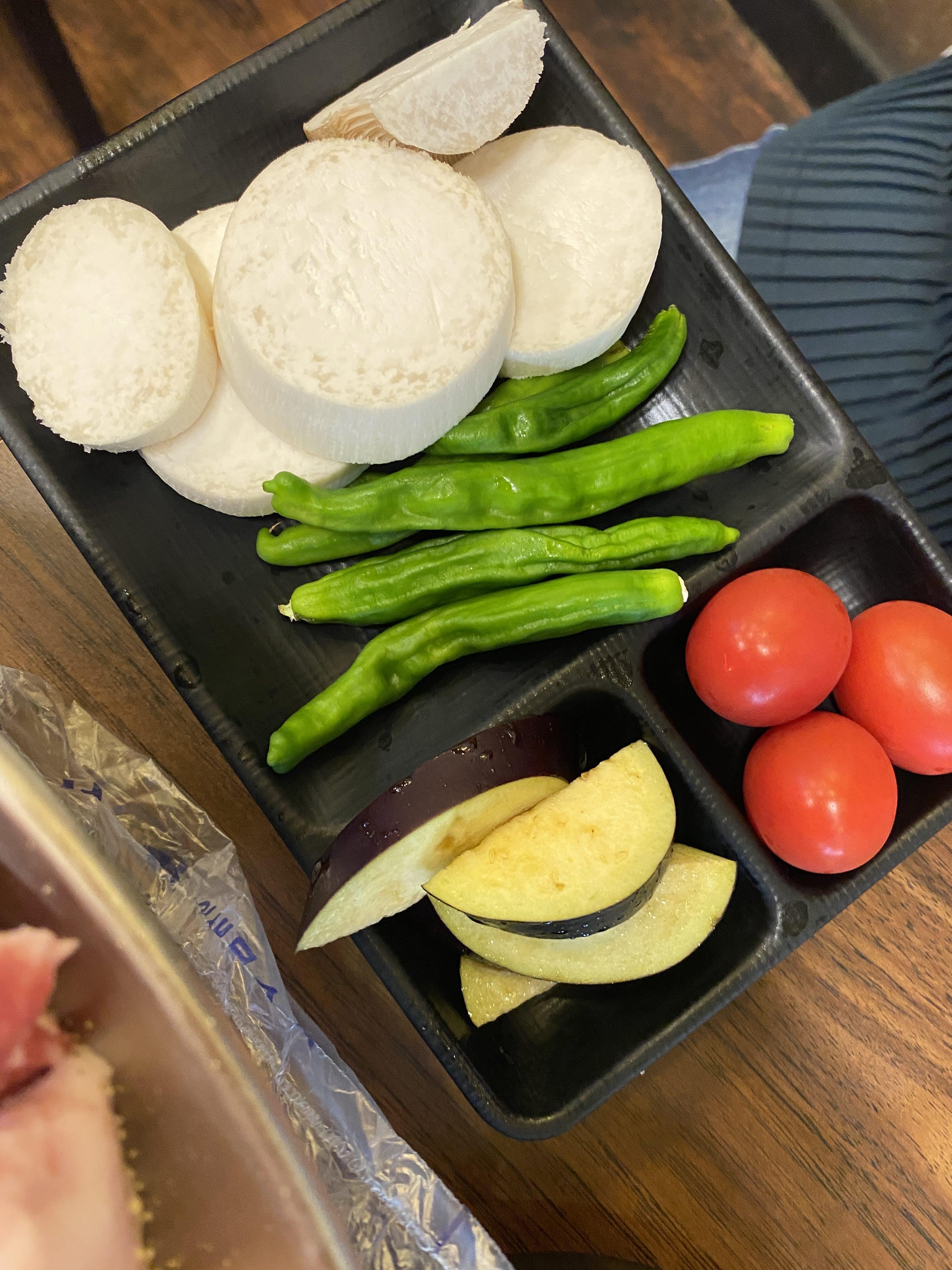고기가 나왔다. 처음에 고기 보고 양이 너무 적어서 좀 실망했다. 고기 시키니까 가지랑 방울토마토, 버섯, 꽈리고추 등을 줘서 같이 구워 먹었다.