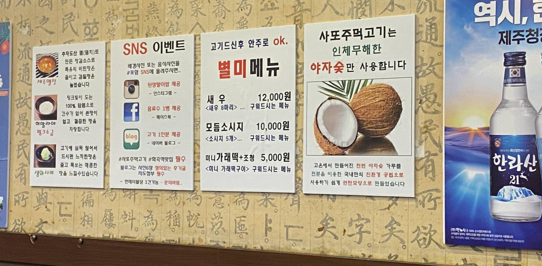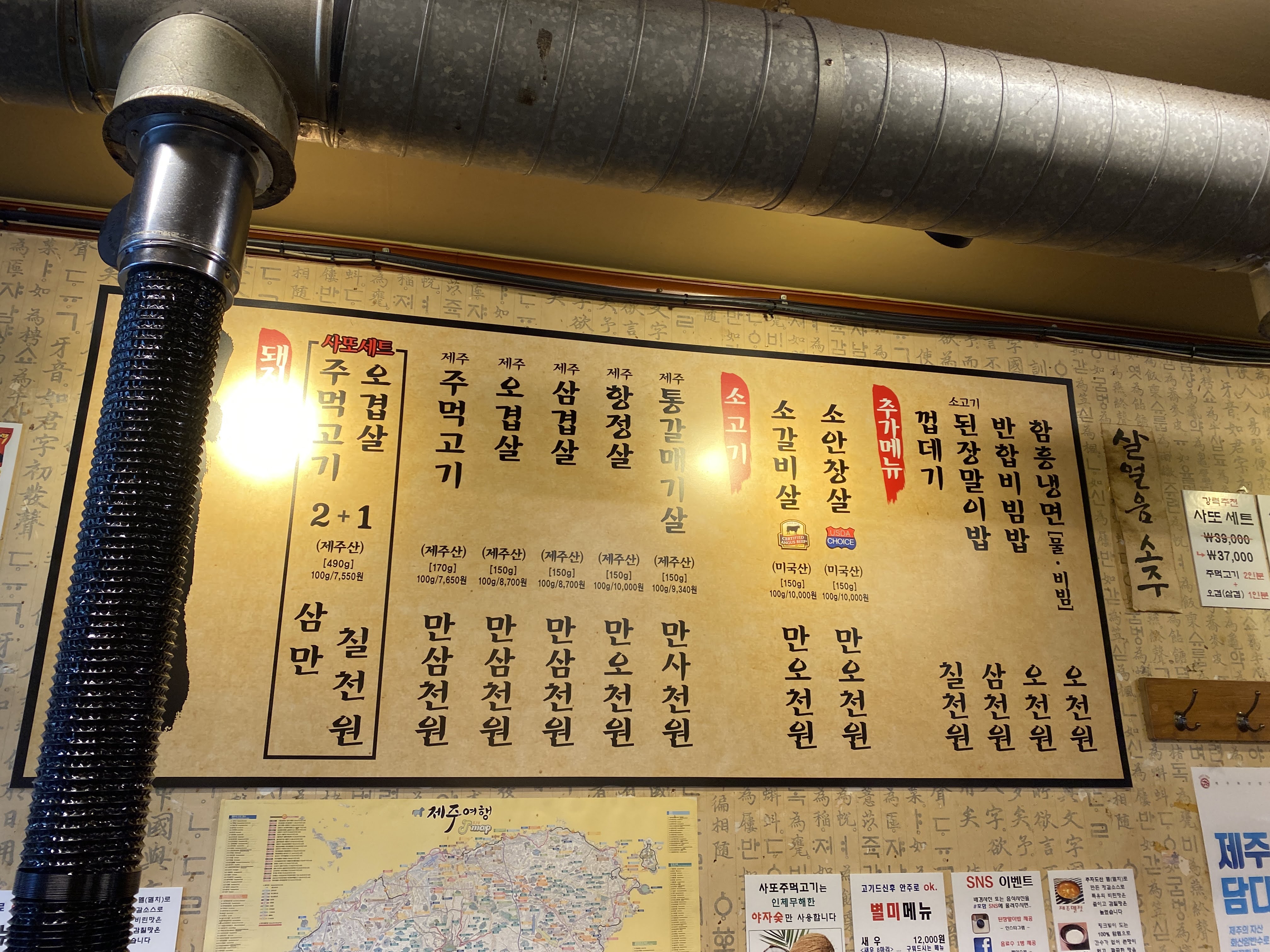 일단 앉아보니 제주 돼지고기를 취급하는 곳이었다. 주문은 사또 세트를 일단 시켰다. 소금, 고추냉이, 양념장, 쌈장, 깻잎절임, 무채, 상추쌈이 나왔다.