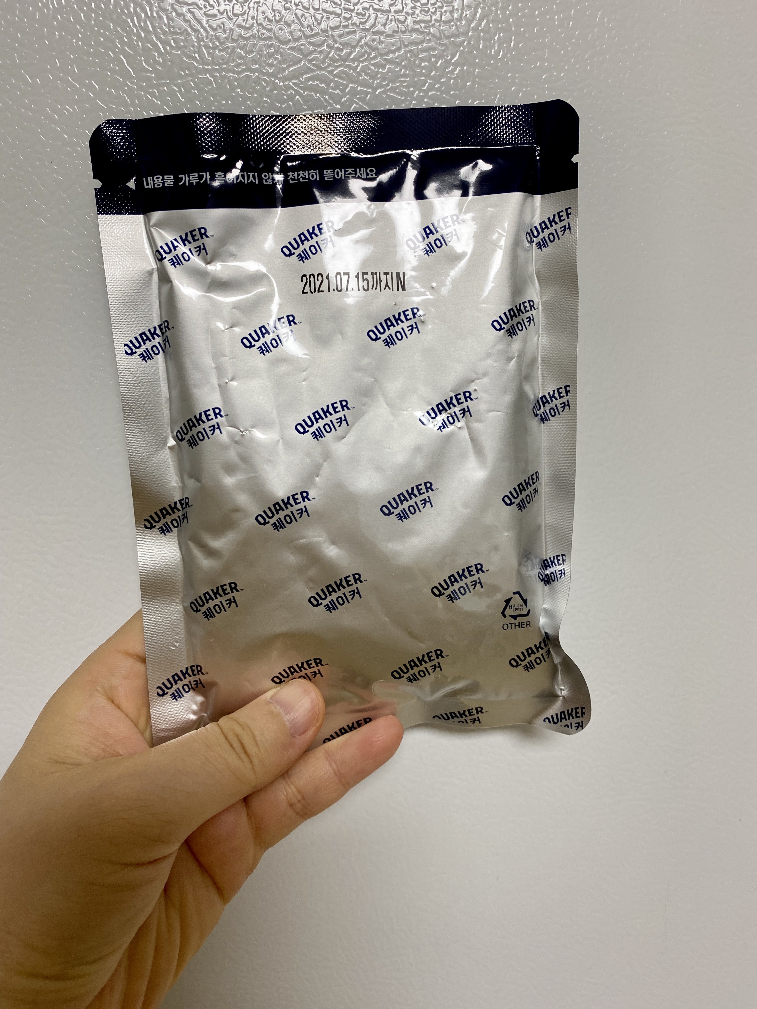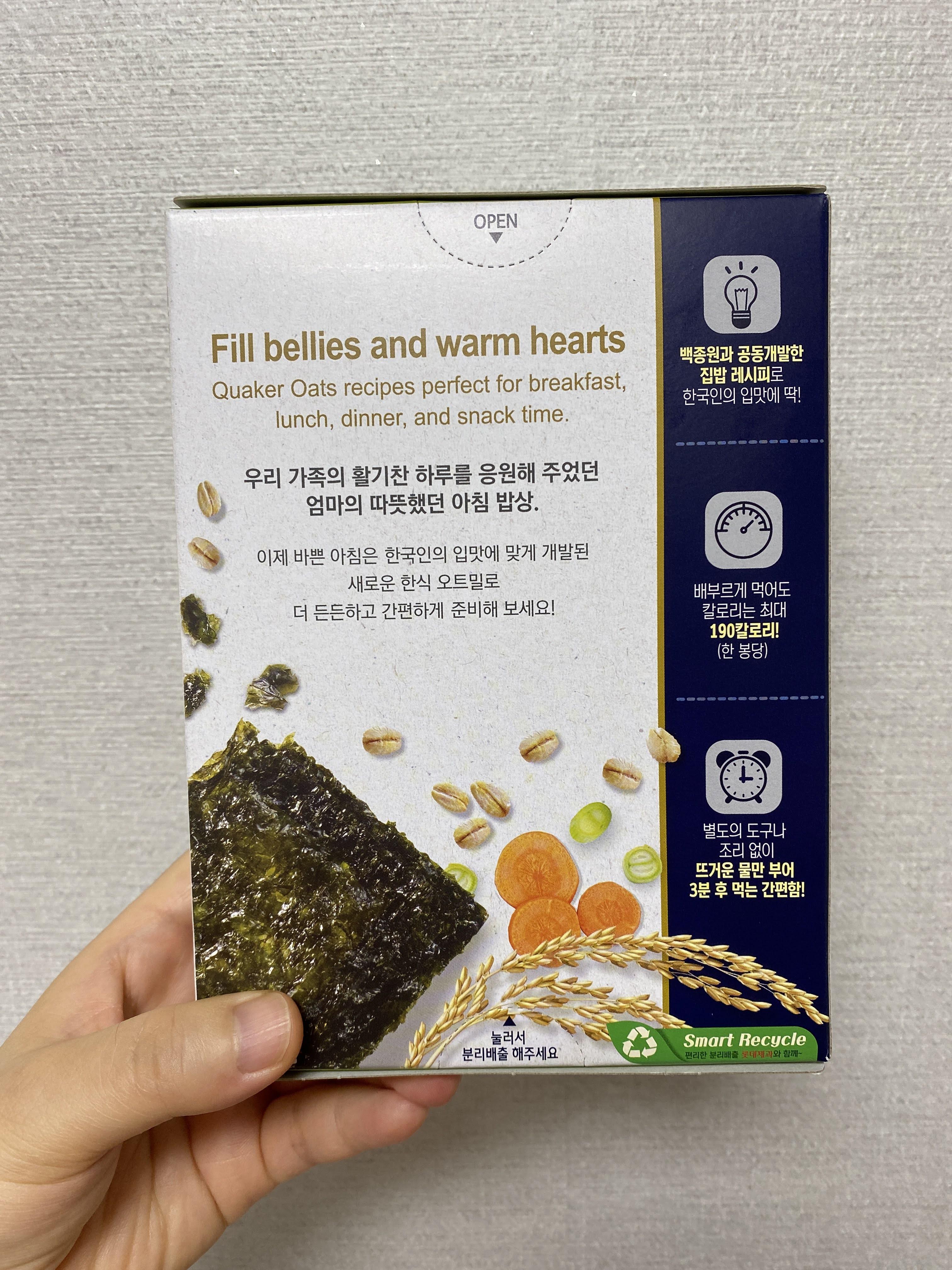 저번에 누룽지 맛 오트밀에 이어 구운 김 오트밀을 샀다. 이것도 역시 전면에 퀘이커교도 같은 옷을 입은 백쌤이 지켜보고 계시다.