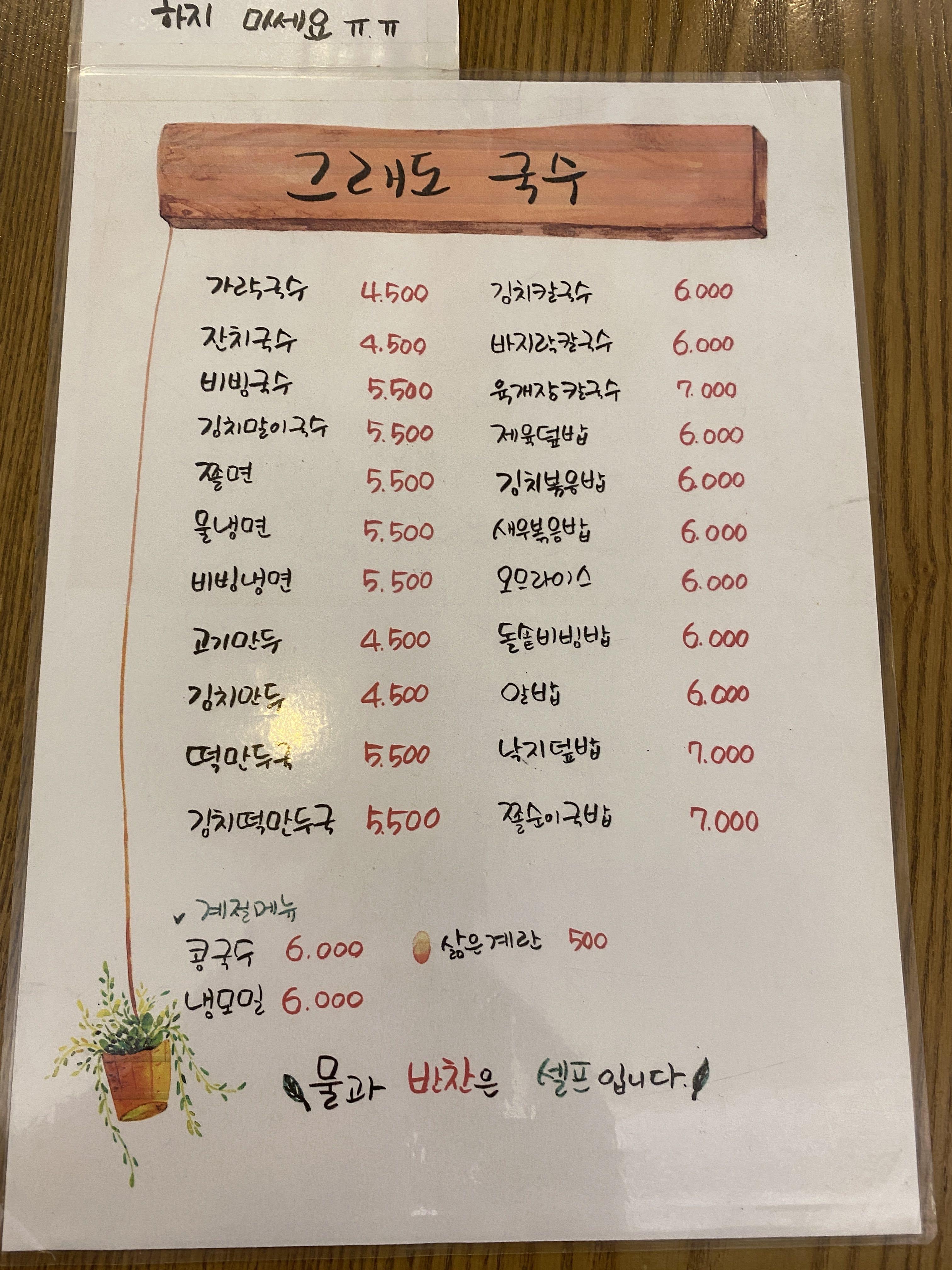 가만히 본 결과 인기 있는 메뉴는 콩국수. 하긴, 콩국수가 6천 원이라니 엄청 저렴하다. 보통 8천 원 정도는 내야 하는데.나는 고기만두랑 비빔국수랑 김치칼국수를 시켰다. 동거인이랑 같이 가서 메뉴가 좀 많다.