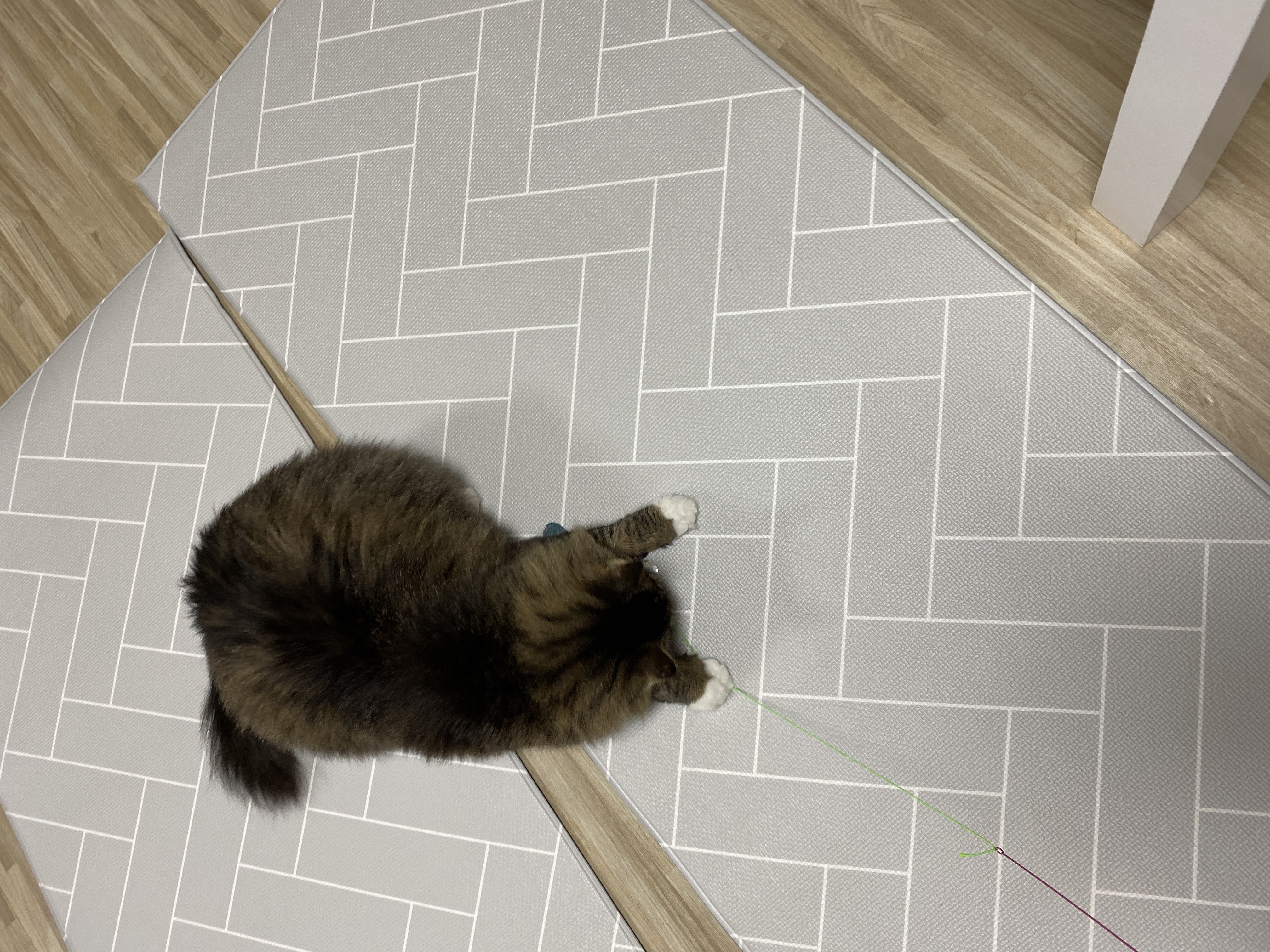 그런데 고양이 양반이 묵직하고 놀 때 뛰어오르는 힘이 장난이 아니라서 매트가 밀린다.
