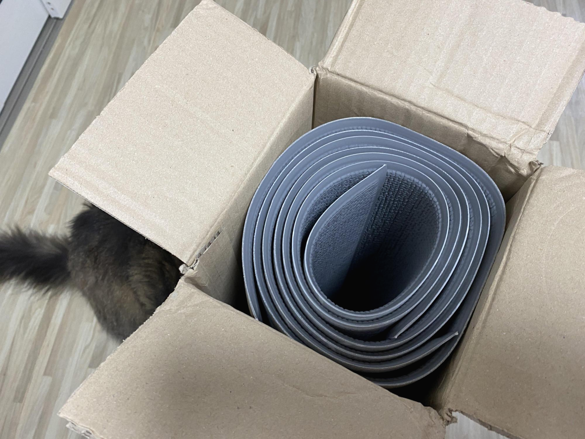 사이즈가 좀 혼란스러웠는데 가장 작은 사이즈 매트 두 개를 샀다. 하나는 캣타워 밑에 깔고, 하나는 놀 때 펴서 쓰려고!상자에 잘 담겨서 도착.