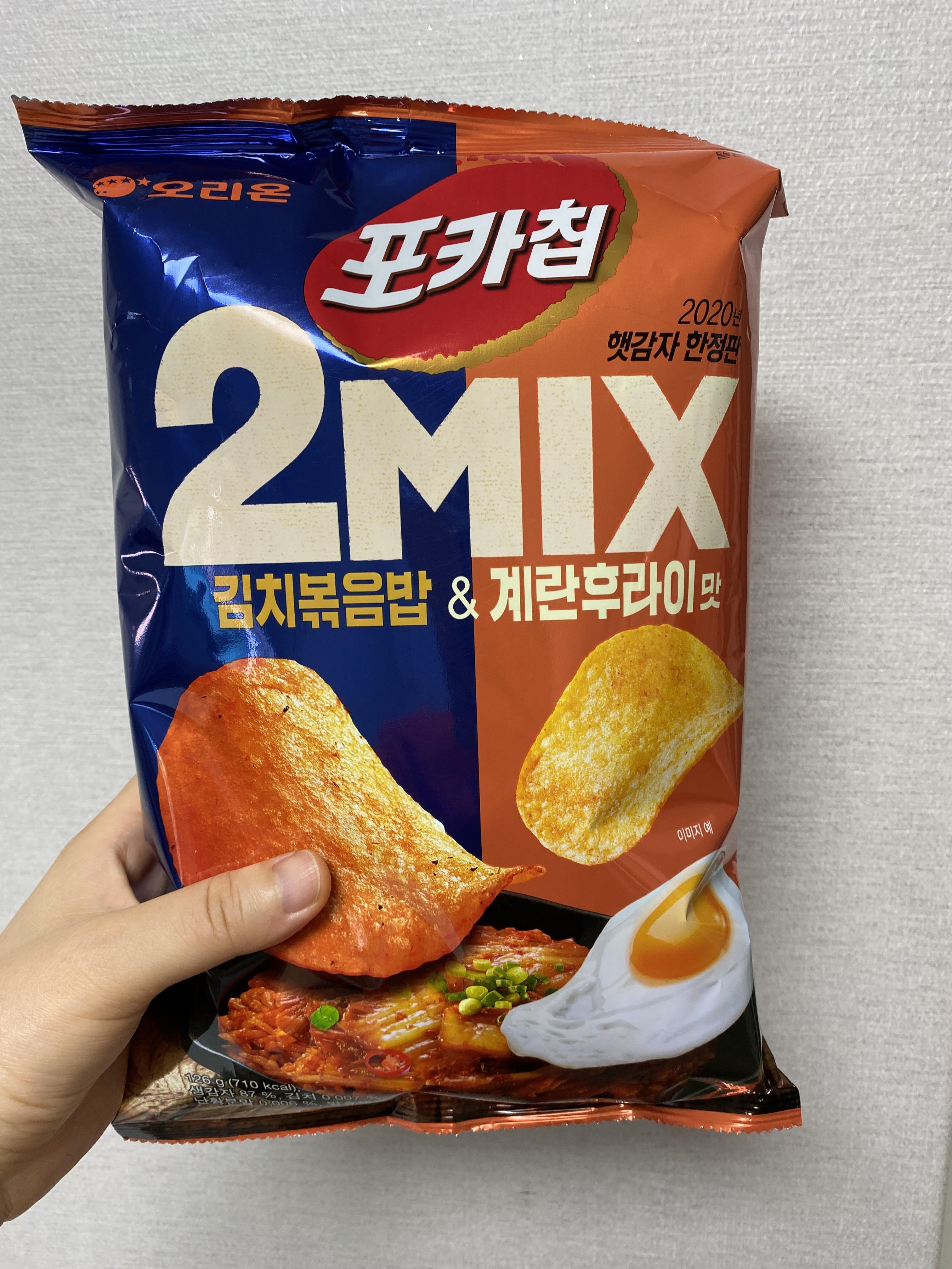 이제 별별 감자칩 맛이 다 나오는데, 심지어 두 개를 섞은 맛까지 나온다. 이번에 산 건 포카칩 2 MIx 김치볶음밥 달걀후라이 맛이다. 아, 이름도 참 길다. 이거 처음 편의점에서 봤을 때는 애써 외면했다. 그동안 먹은 새로 본 도전적인 감자칩 맛이 다 좀 내 입맛이랑 멀었기 때문이다. 하지만 이건 괜찮다는 사람도 있고... 호불호가 강한 거 같았고 호불호 감자칩인 식초 맛 감자칩의 충격에서 벗어난 지 얼마 지나지 않았지만 이 몹쓸 호기심 때문에 결국 결제! 감자에 소금이면 됐지 김치볶음밥에 달걀 후라이가 다 무슨 소용이란 말이요!! 싶지만 그래도 궁금해..