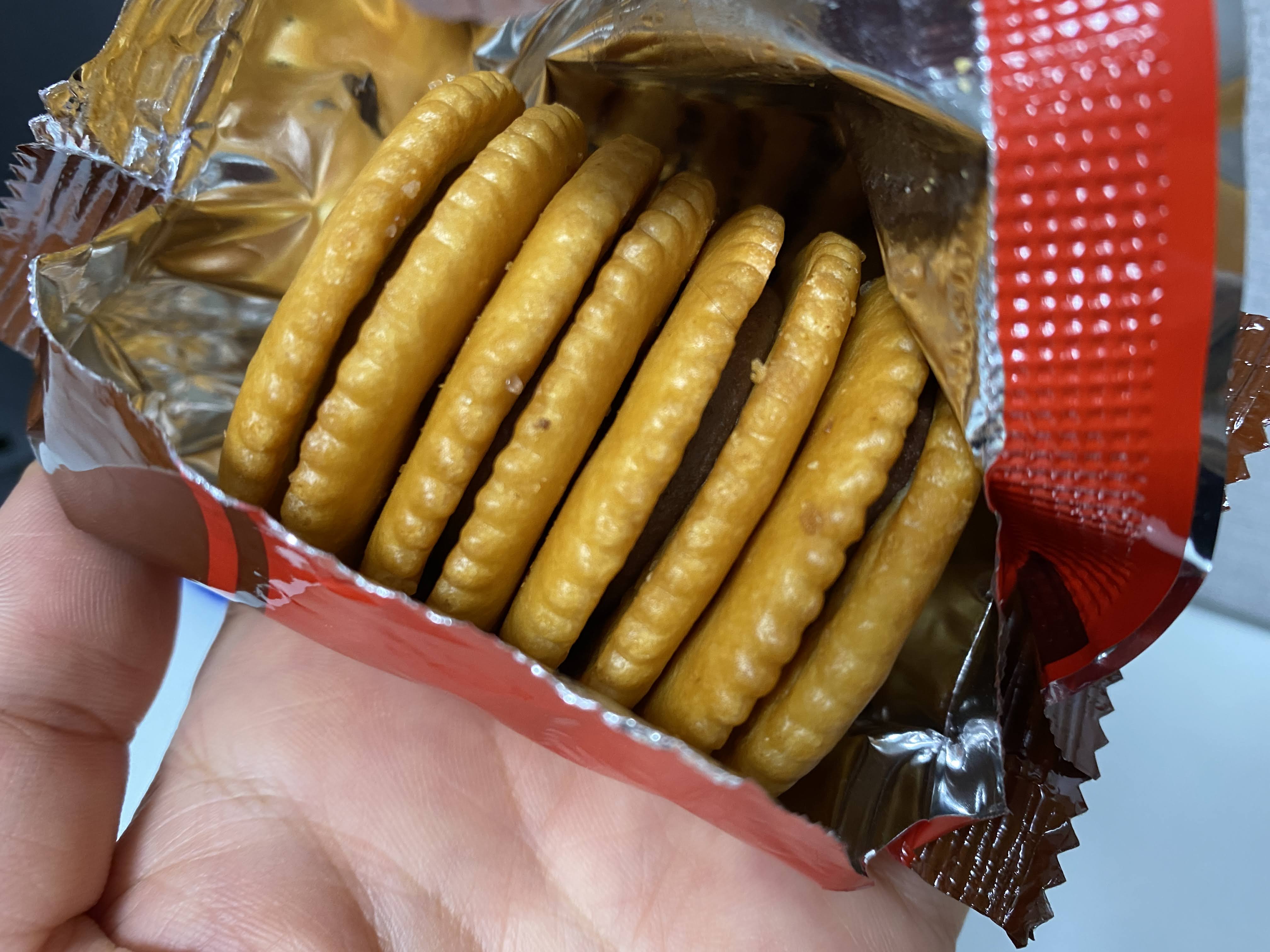 소포장이 먹기는 편한데 쓰레기도 좀 걱정이고 양도 적어지니까 그냥 하나로 해 줬음 싶기도 하다. 하나에는 4개의 초코 샌드 크래커가 들었다.