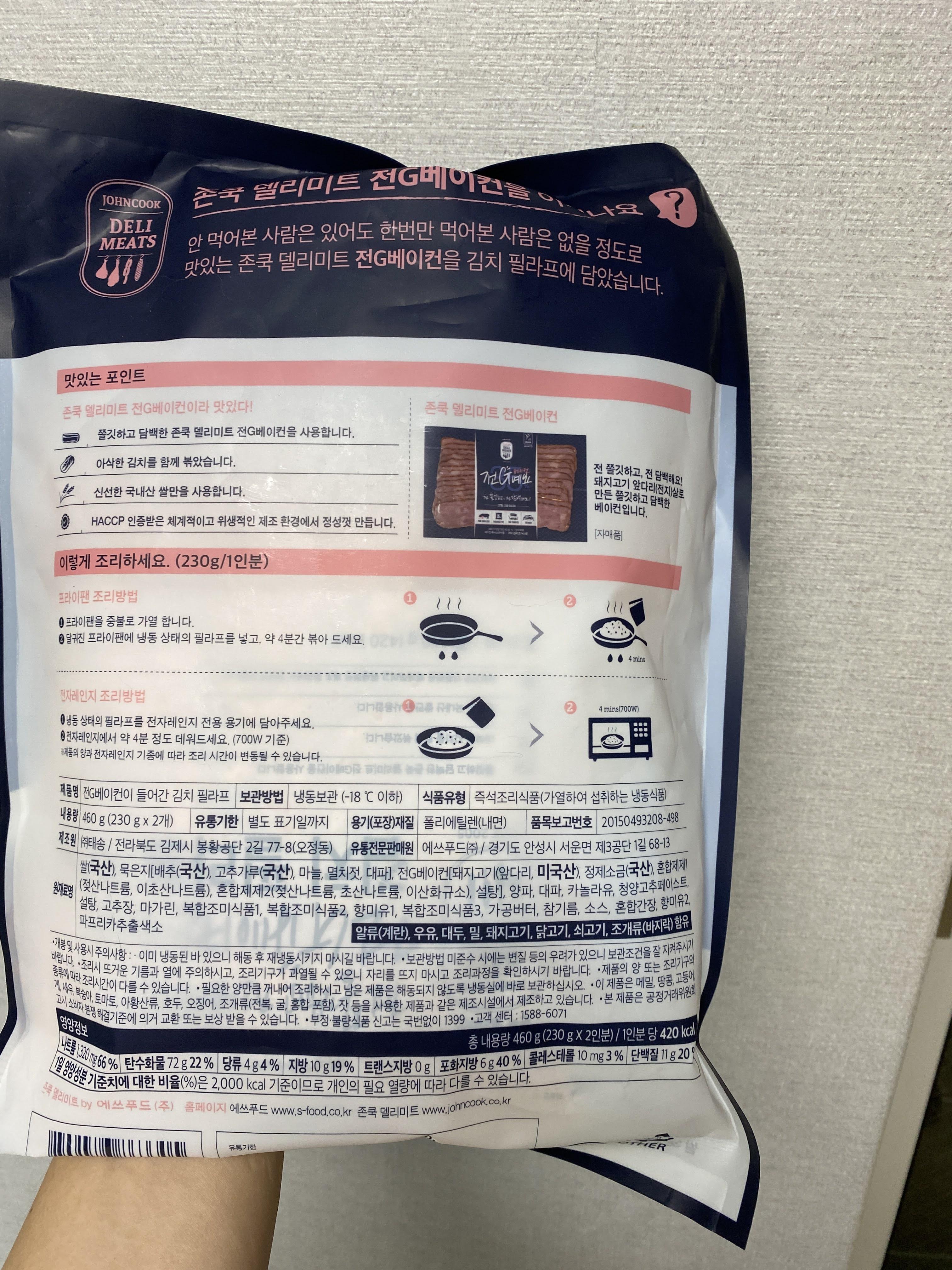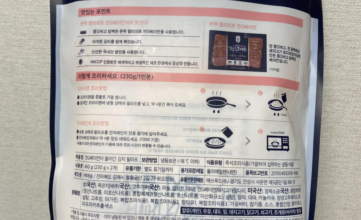 뒷면을 보면 프라이팬에 볶아 먹어도 되고 전자레인지에 간단하게 덥혀 먹어도 된다고 적혀 있다.