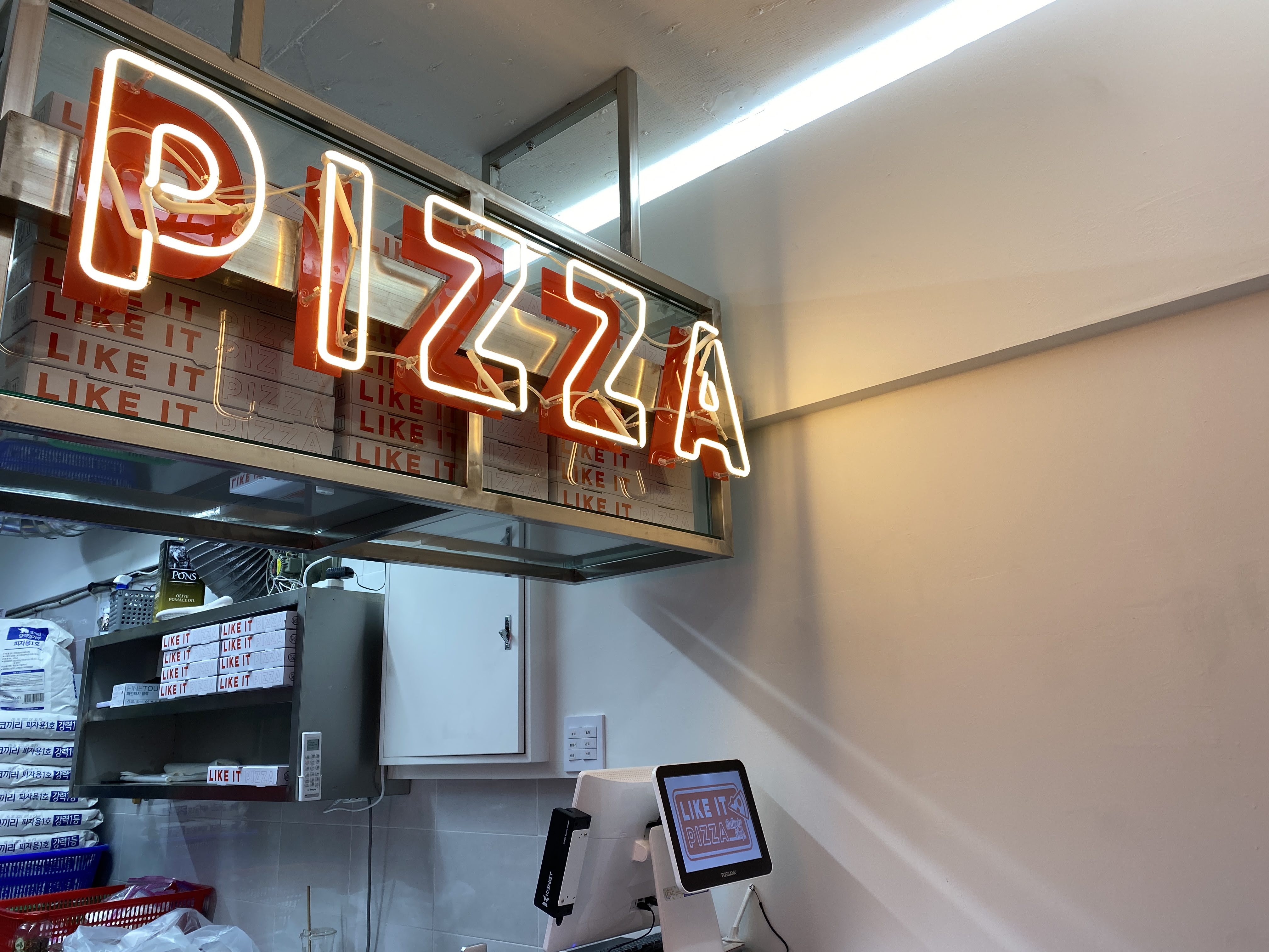 우리가 주문한 건 더블 치즈 버거 피자. 주문하고 잠시 기다리면서 찍은 가게 안 네온사인. 이런 네온사인은 참 귀엽고 힙하다.