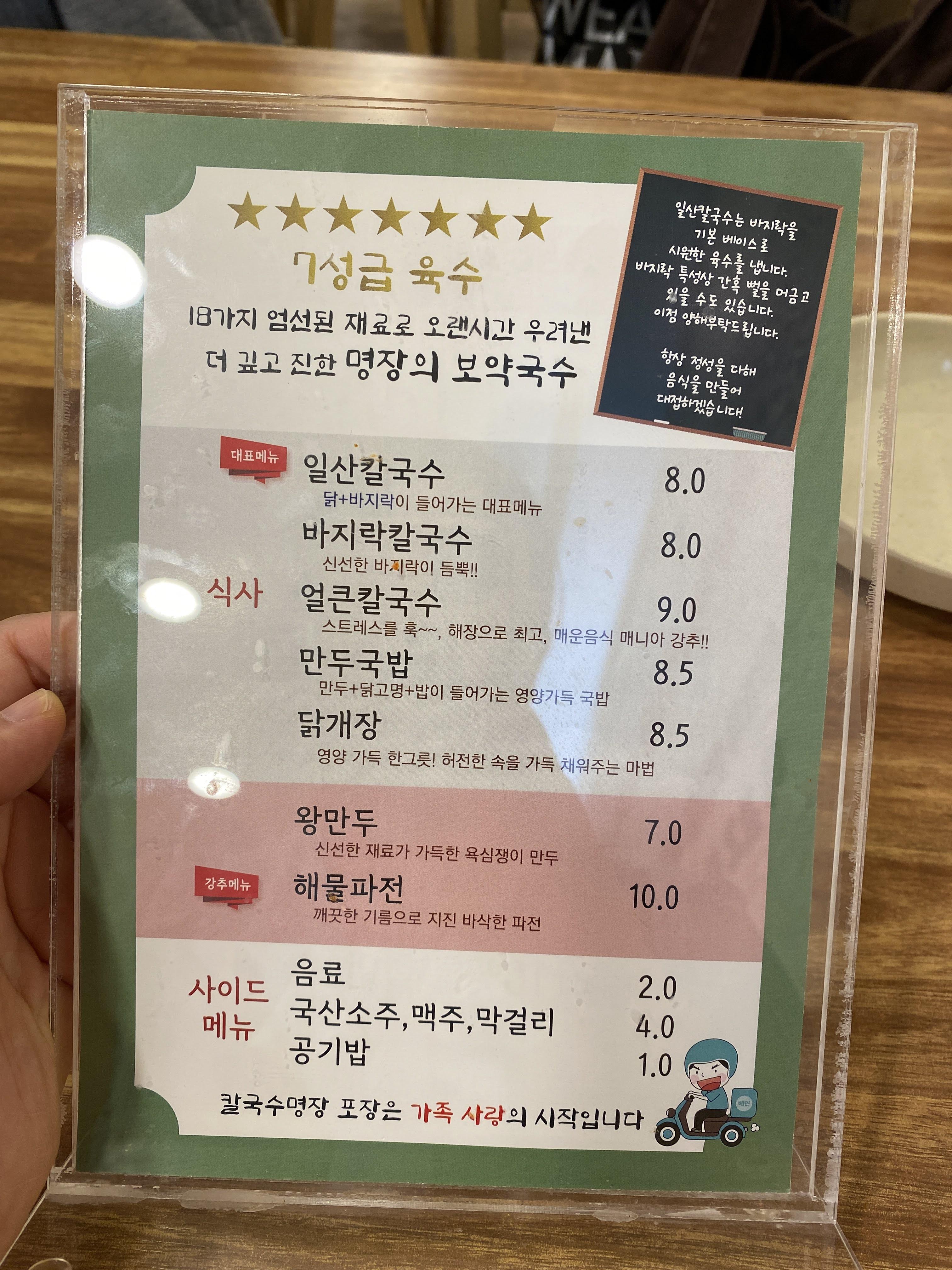 이름은 일산 칼국수 명장. 입간판이 아니면 그냥 지나갈 뻔한 가게인데 개업한 지 얼마 안 되었는지 가게가 반짝반짝한 게 인상적이었다.