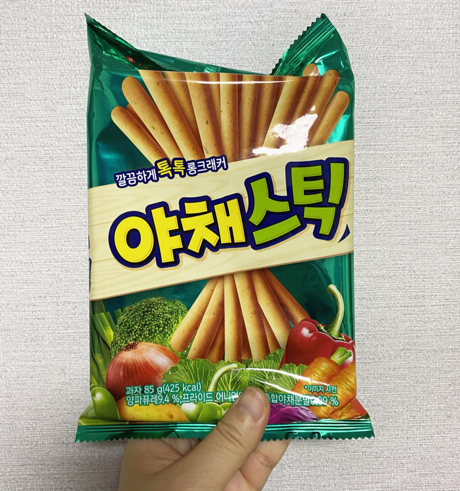 새로운 과자 발견! 야채스틱이다. 완전 새로운 과자인 줄 알았는데 그건 아니고, 이미 있는 야채 크래커를 스틱 모양으로 만들어서 새롭게 내놓았다. 이거랑 빠다코코낫도 스틱 과자로 나왔지만, 빠다코코낫보다는 야채 크래커를 좋아해서 이것만 샀다.