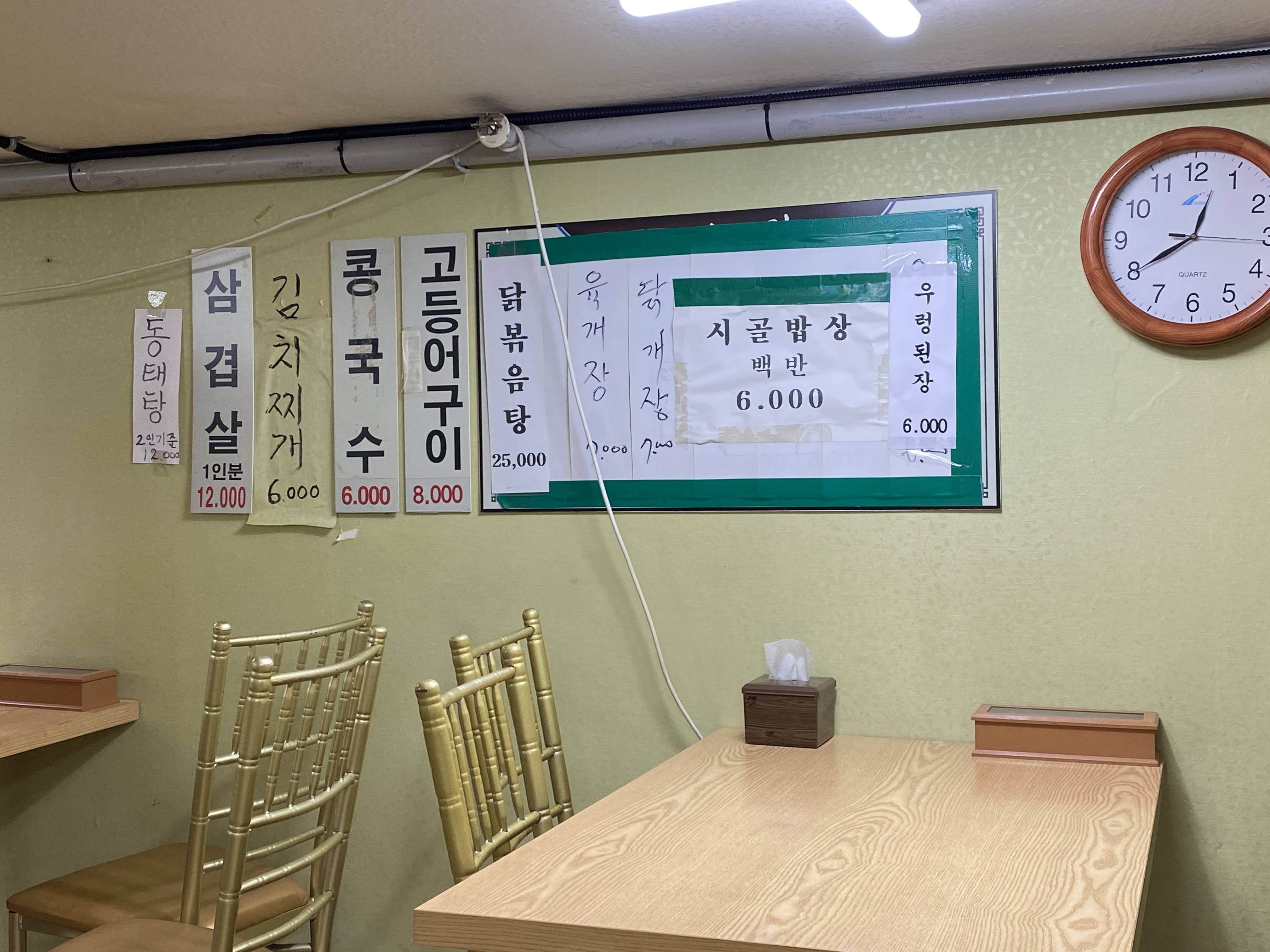 허름하고 대충 만든 것 같은 공간에 사람들이 아무렇지도 않게 밥을 먹는다. 진짜 타임머신 타고 온 기분이 든다. 가게 메뉴는 생각보다 다양하다. 오늘은 가게 이름을 걸고 있는 시골밥상 백반을 시켰다.