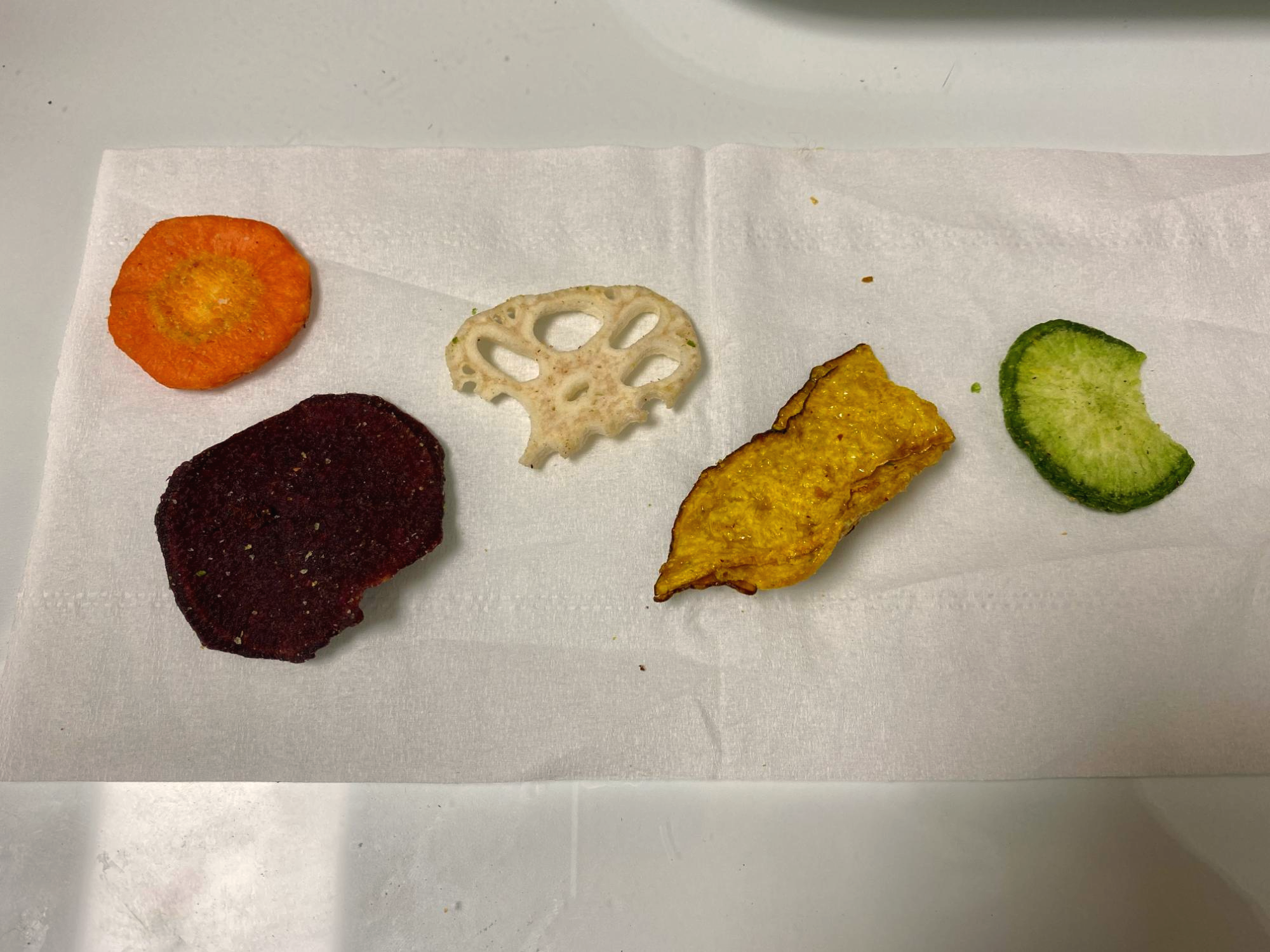 하나씩 꺼내서 휴지 위에 올려놓았다. 원형이 제법 잘 살아 있다. 그냥 튀긴 것 같지는 않고, 채소를 말린 다음에 튀긴 거 같다.