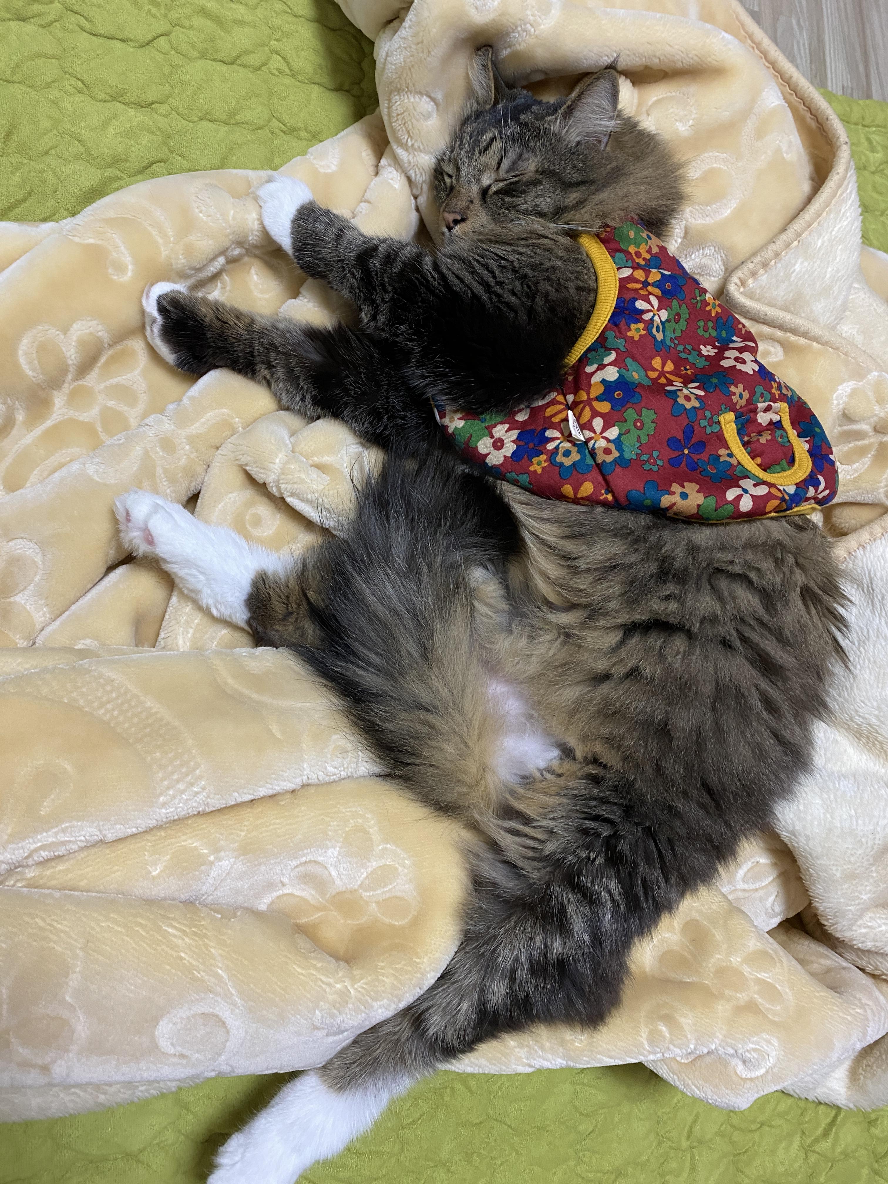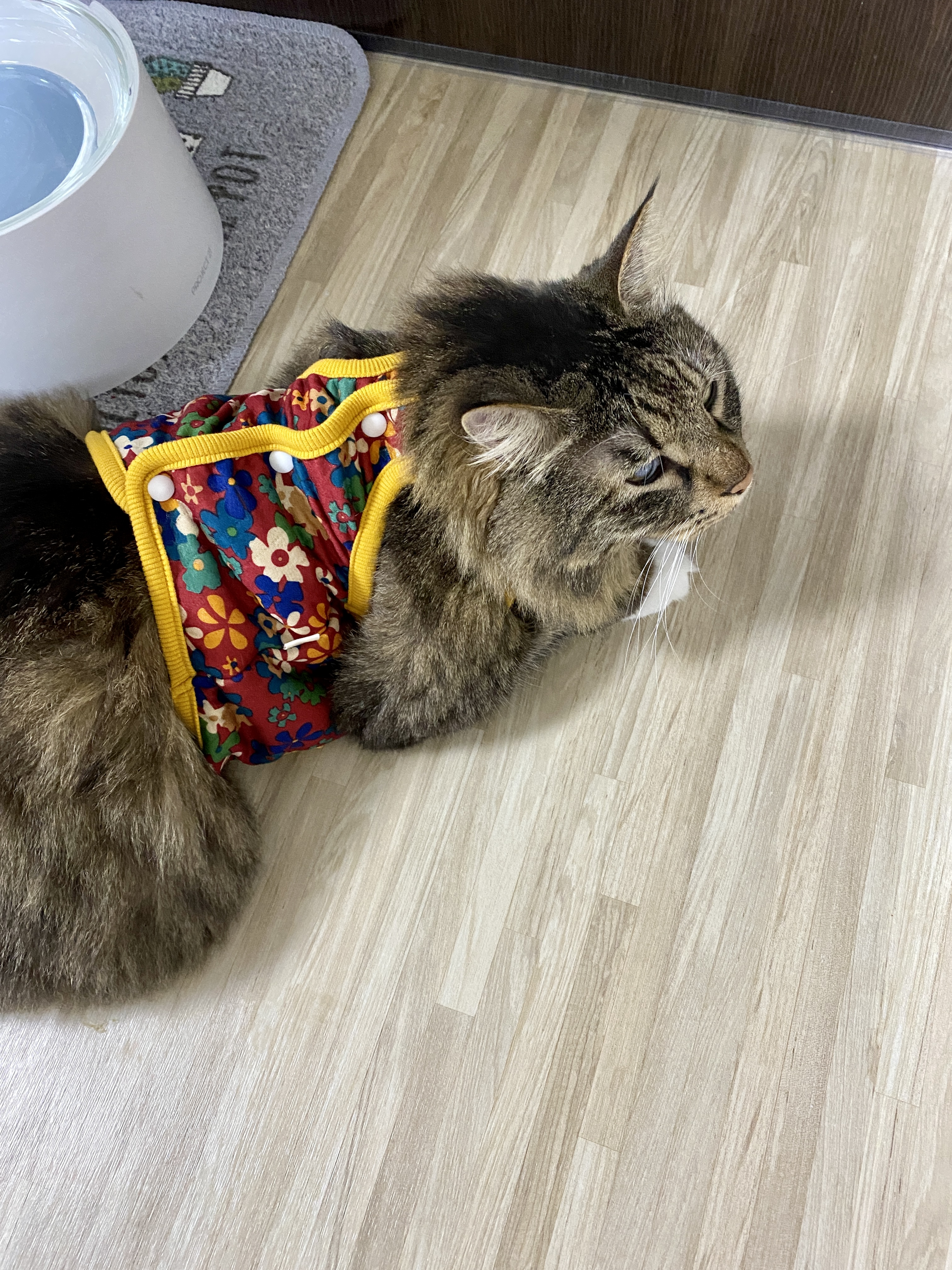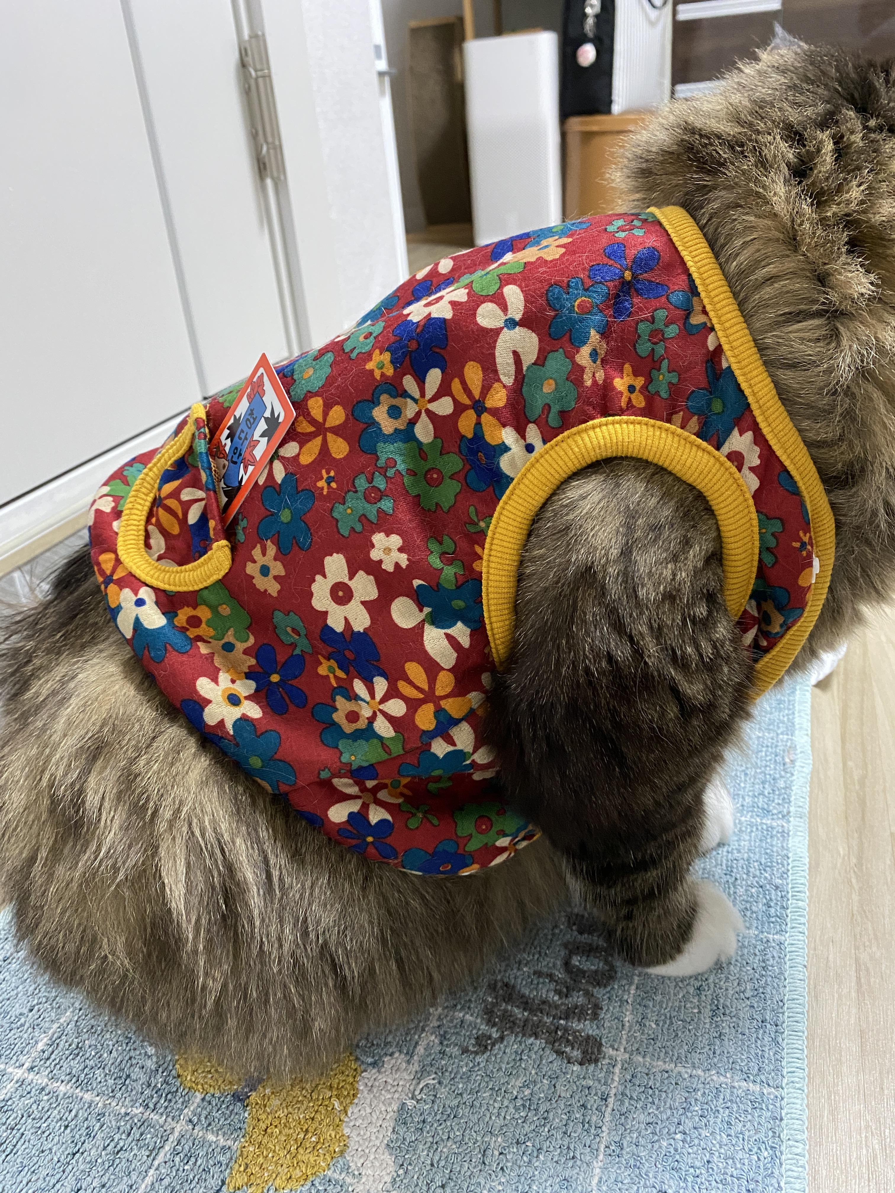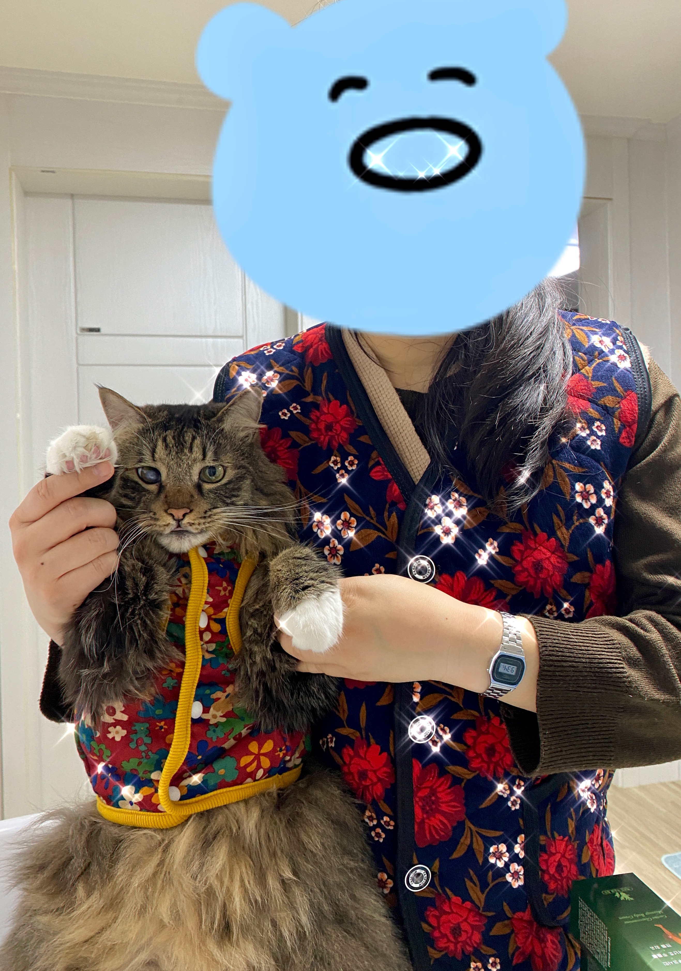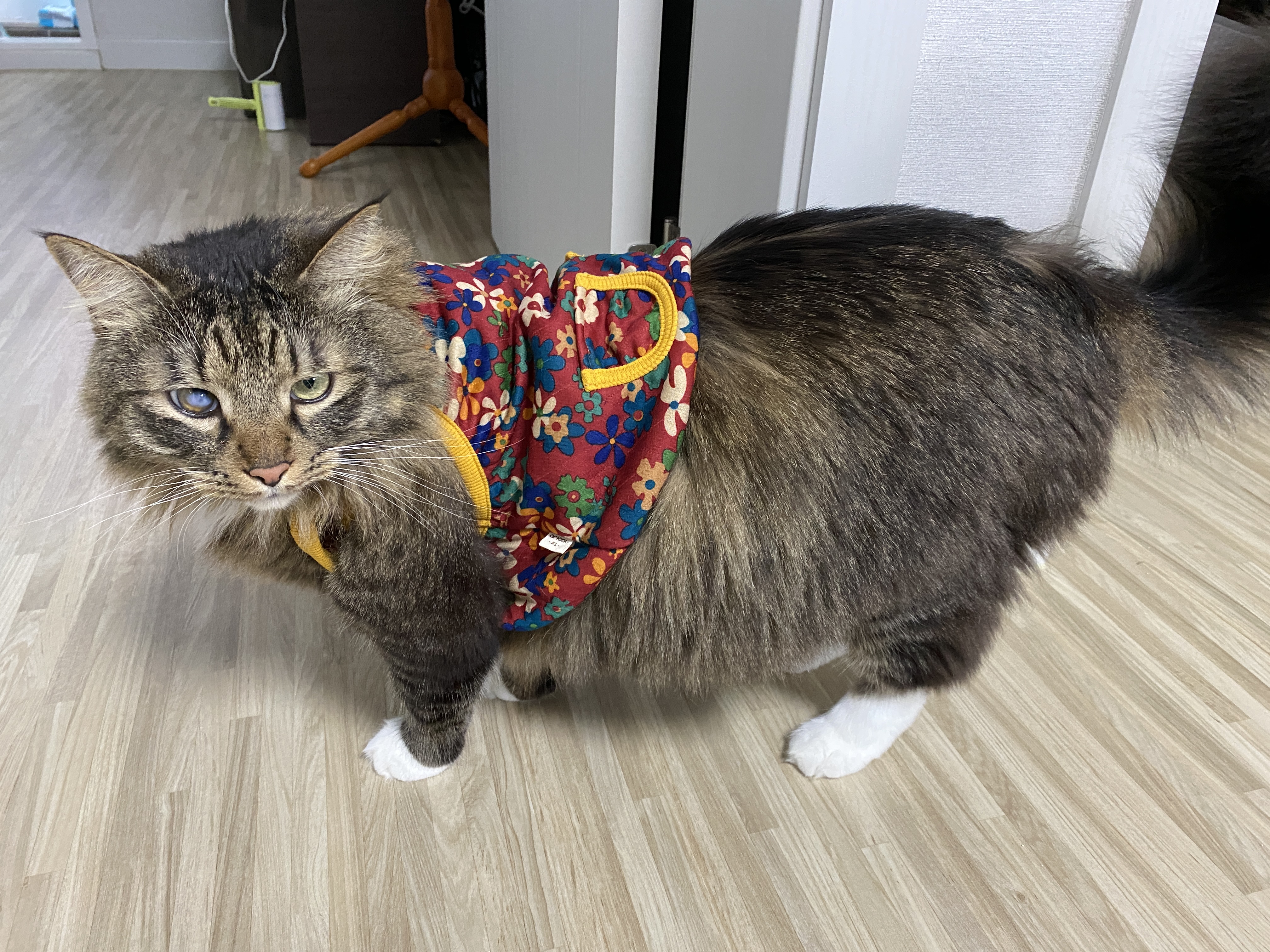 제대로 입혔지만 얼굴에 ‘이런 걸 왜...?’ 하는 듯이 피곤한 기색을 띠고 있다.