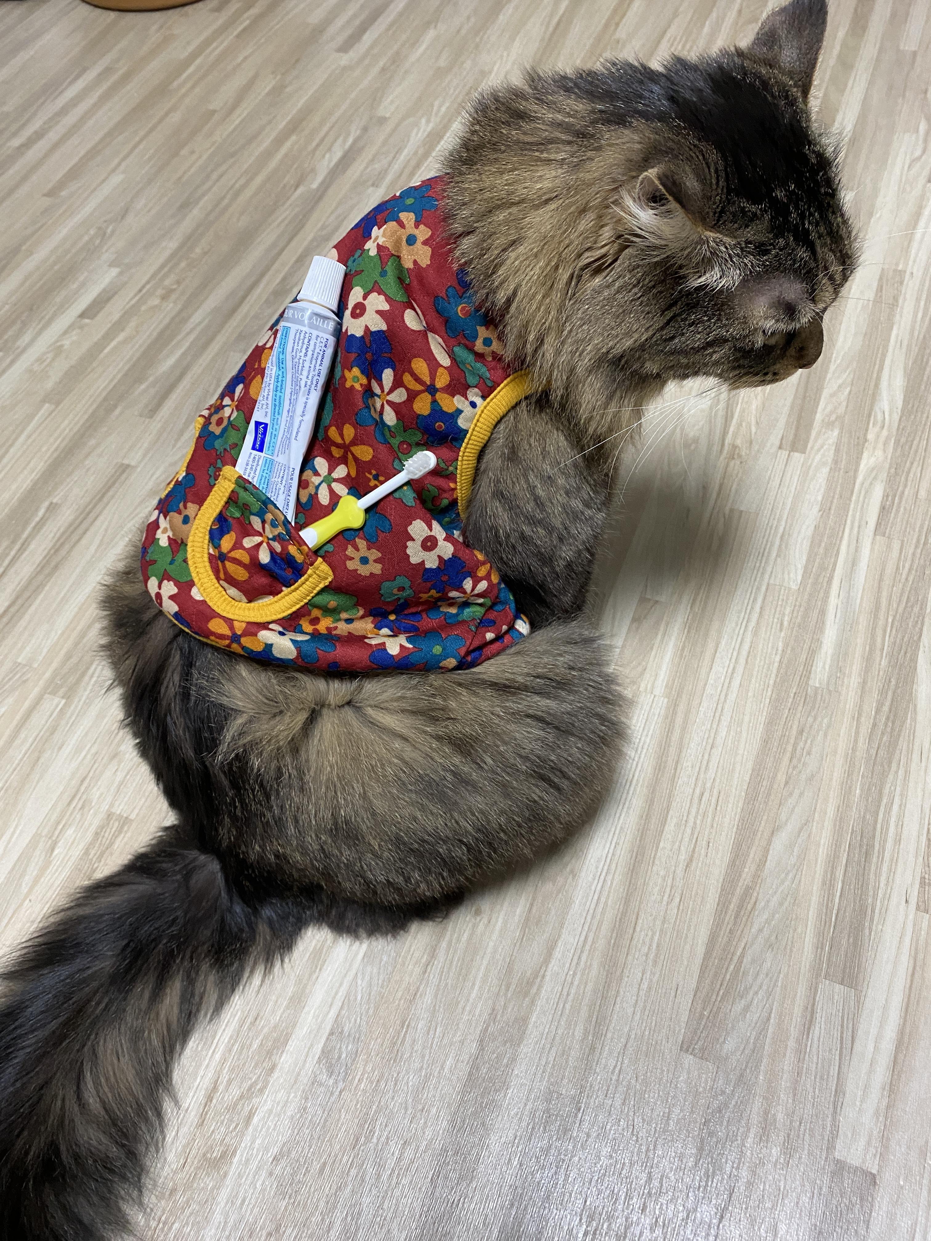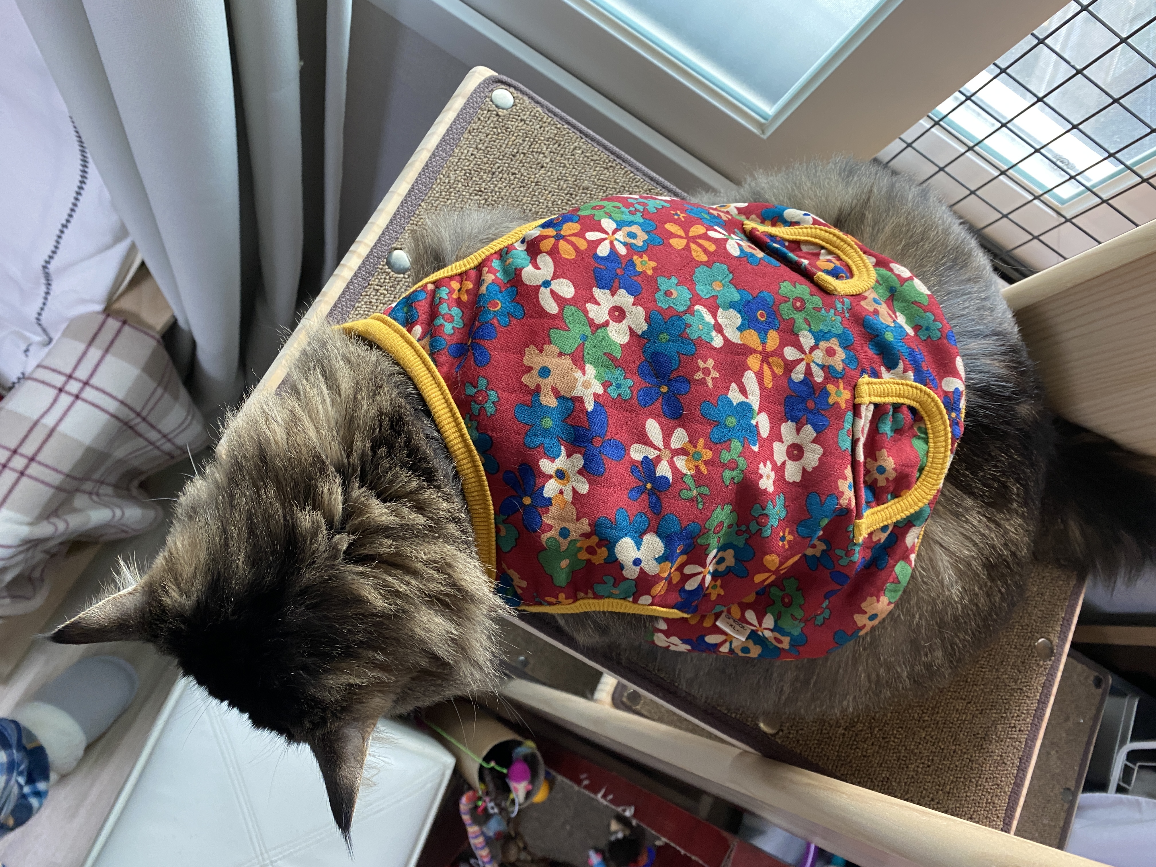 처음에 잘못 입혀서 단추가 등 위로 올라왔다. 딱 봐도 몹시 불편해 보이는 표정.