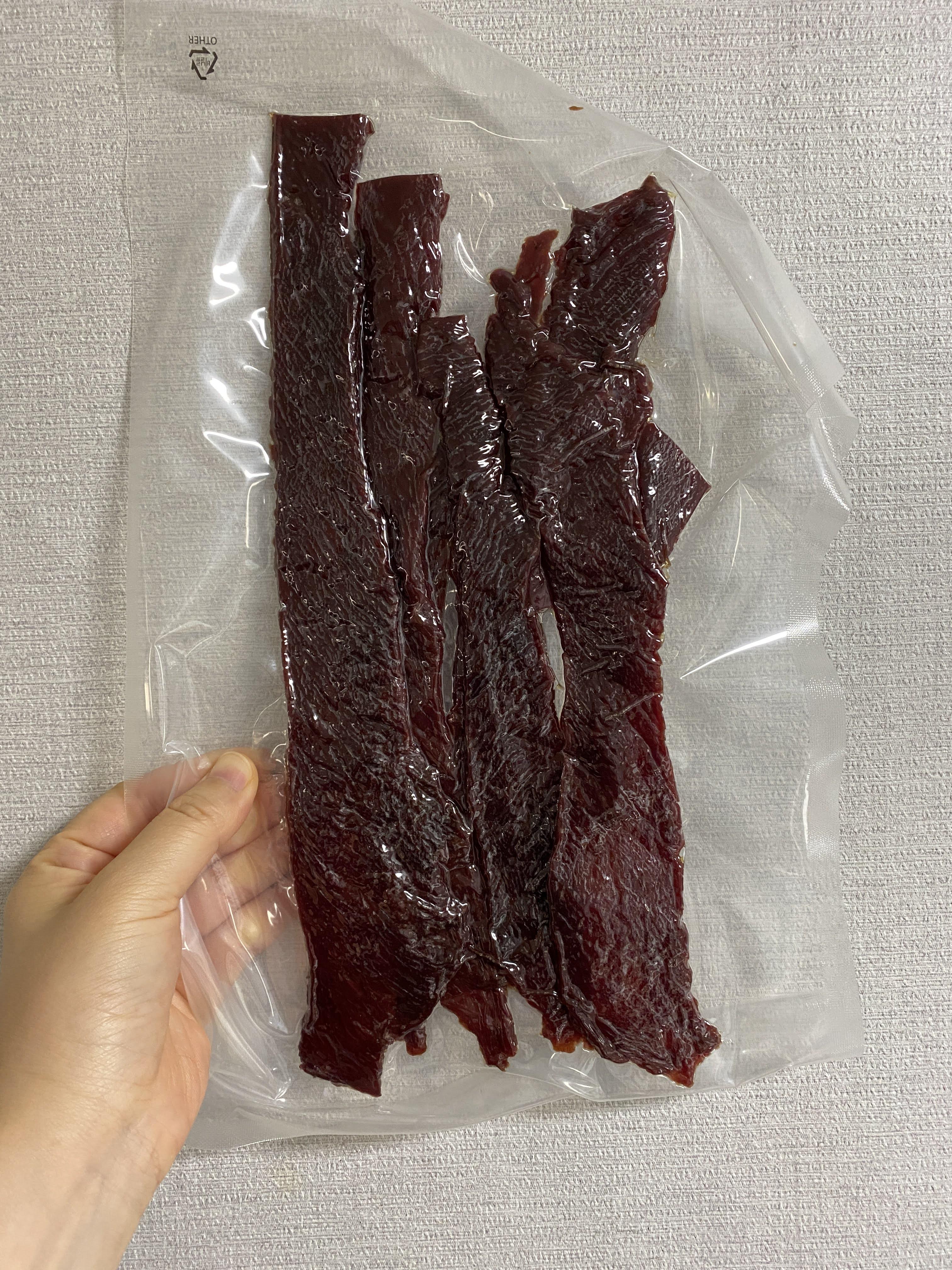 가격은 원래는 13900원인가 그랬던 걸로 기억함. 이날은 할인받아서 8900원에 샀던 거 같음. 안에는 빨간 육포랑 마찬가지로 진공포장이 되어 있는데, 좀 더 색이 검붉다.