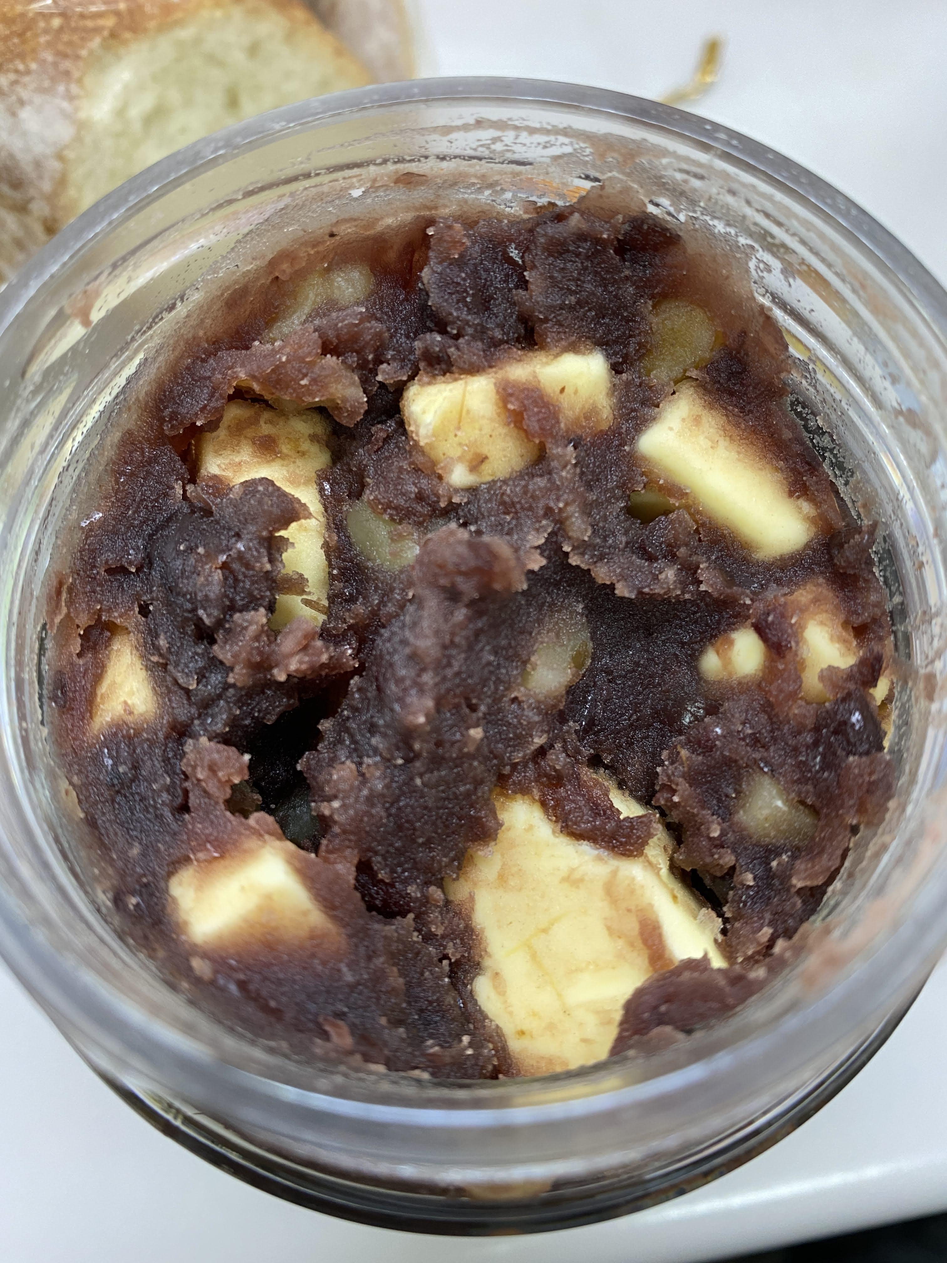 버터의 은은한 짭조름함과 풍미, 팥의 향과 달콤함이 아주 잘 어울렸다. 나도 맛있게 먹었다. 통버터가 아니라 이렇게 큐브로 작게 들어가 있고, 퍼서 바르면서 내가 먹을 만큼만 버터를 골라낼 수 있어서 좋았다. 호두도 들어서 식감과 고소함도 즐길 수 있다.