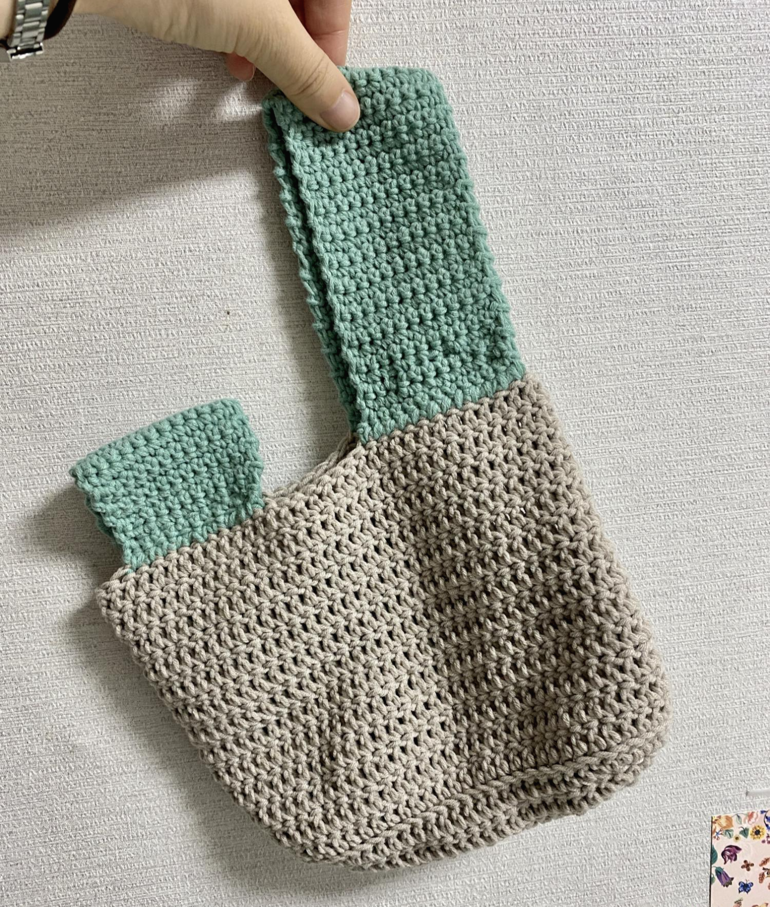 그거만 지키면 가방 부분 뜨는 건 그냥 자기 마음대로 하면 된다고 생각한다. 슉슉 떠서 완성한 봉다리 백. 실이 몸통 부분 뜨고 나니까 똑 떨어져서 손잡이는 다른 색으로 만들었다.