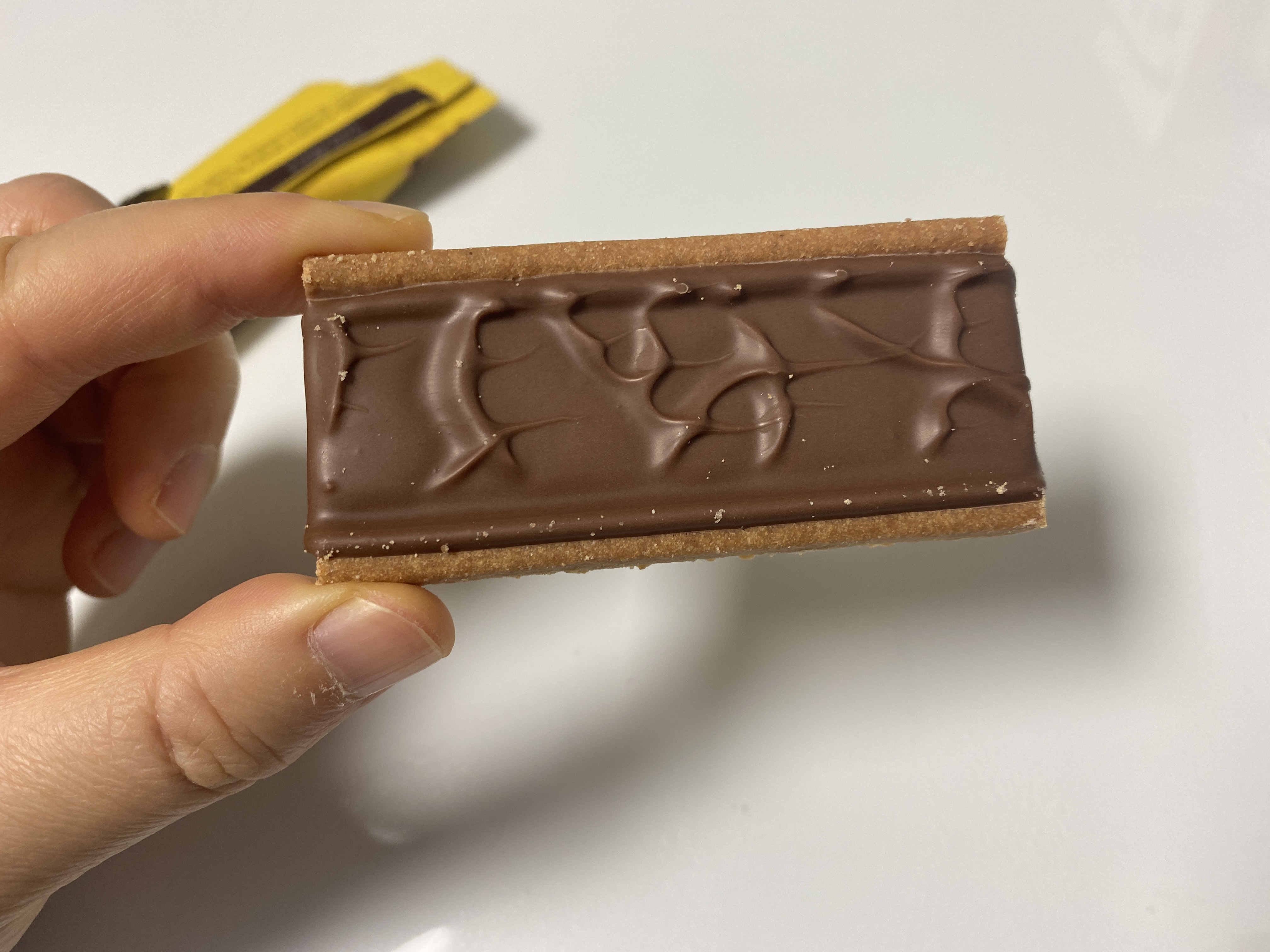 반으로 쪼갰는데 초콜렛과 과자 사이에 카라멜이 들어 있다. 찐득하게 늘어나는 모양이 보기 좋음.
