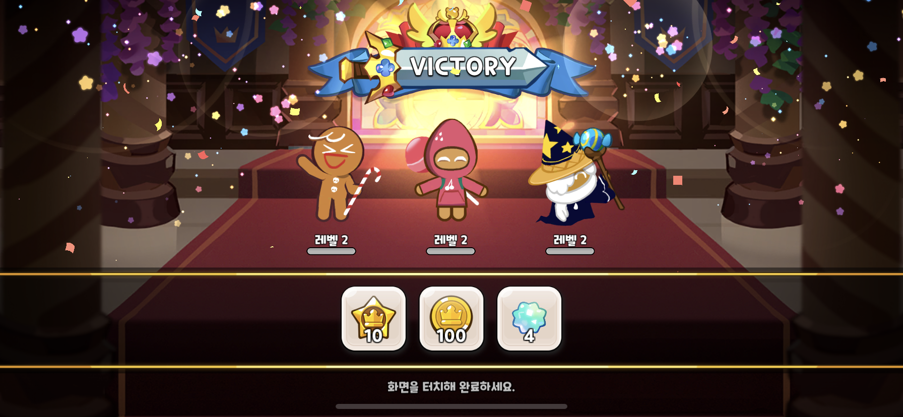 이기면 아래 같은 화면. 쿠키들 신나서 방정맞게 움직이는 게 귀여움.