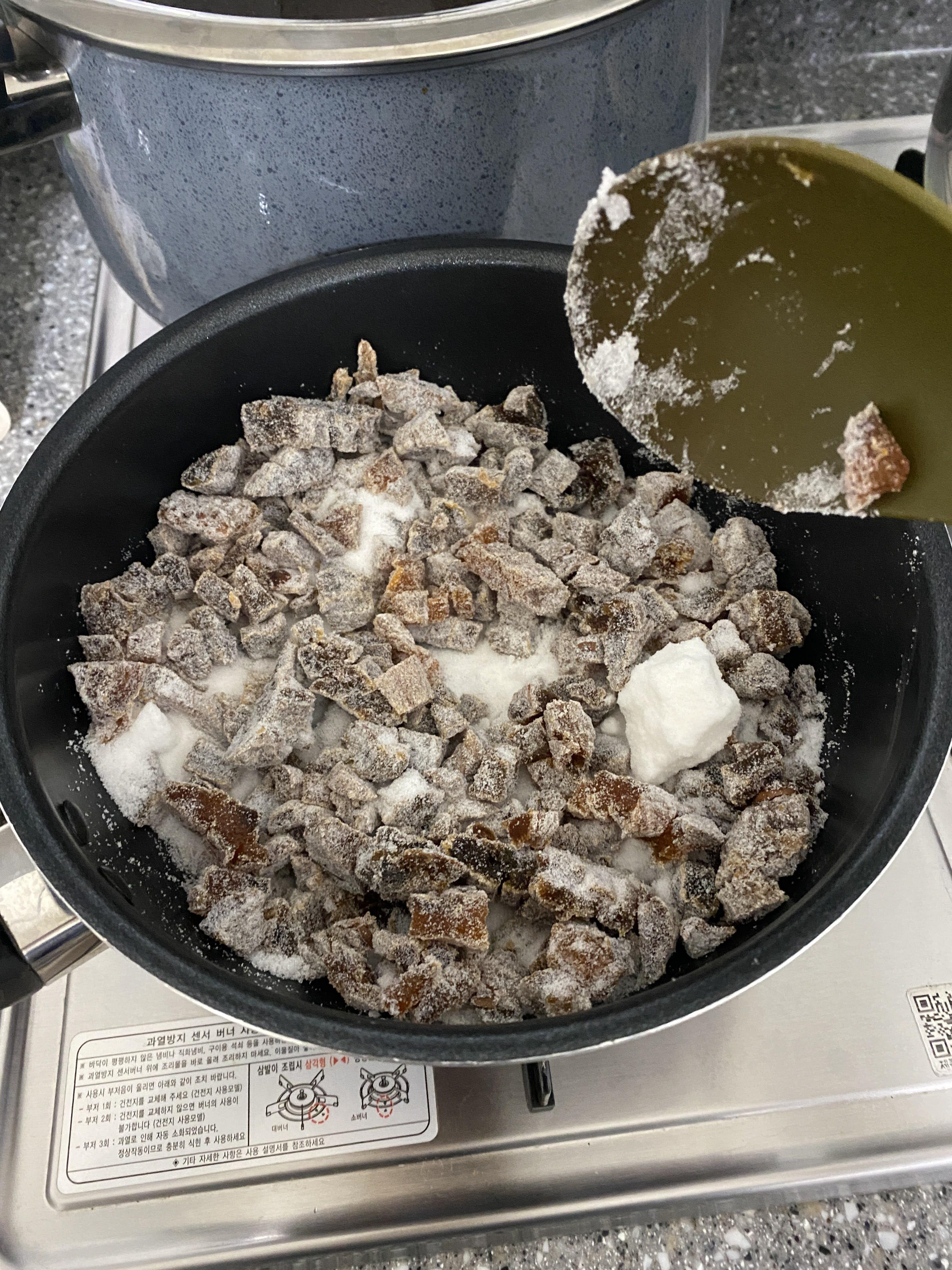 썰다 보니 내 생각보다 곶감 양이 많았다. 좀 하기 싫어질 때쯤 곶감 썰기가 끝났고, 이제 썬 곶감과 설탕을 냄비에 넣고 적당히 윤기가 돌 때까지 계속 휘저으면 된다.