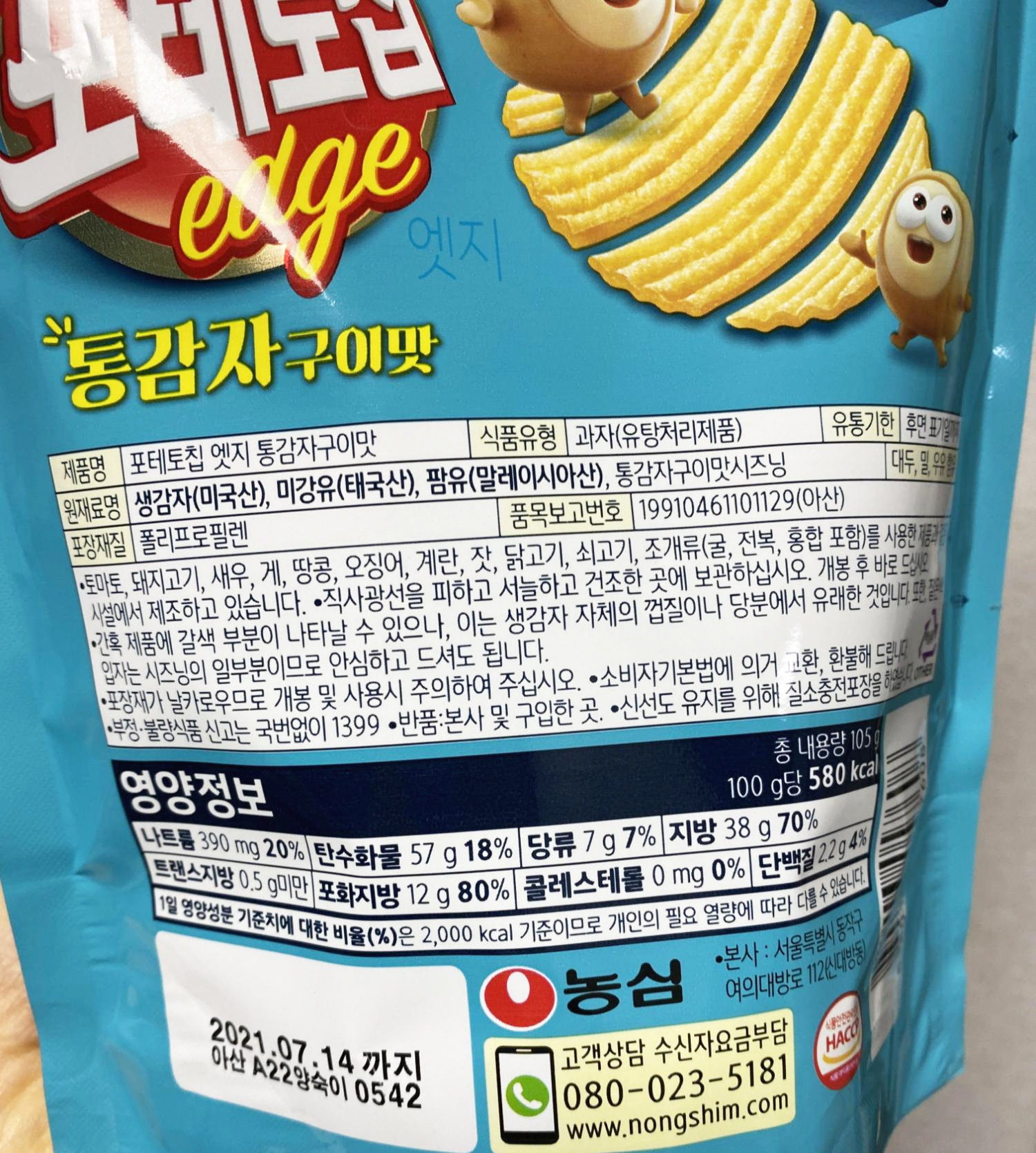 영양정보는 덤! 눈 큰 감자들이 자랑스럽게 감자칩을 자랑하고 있는 모습이 인상적이다.