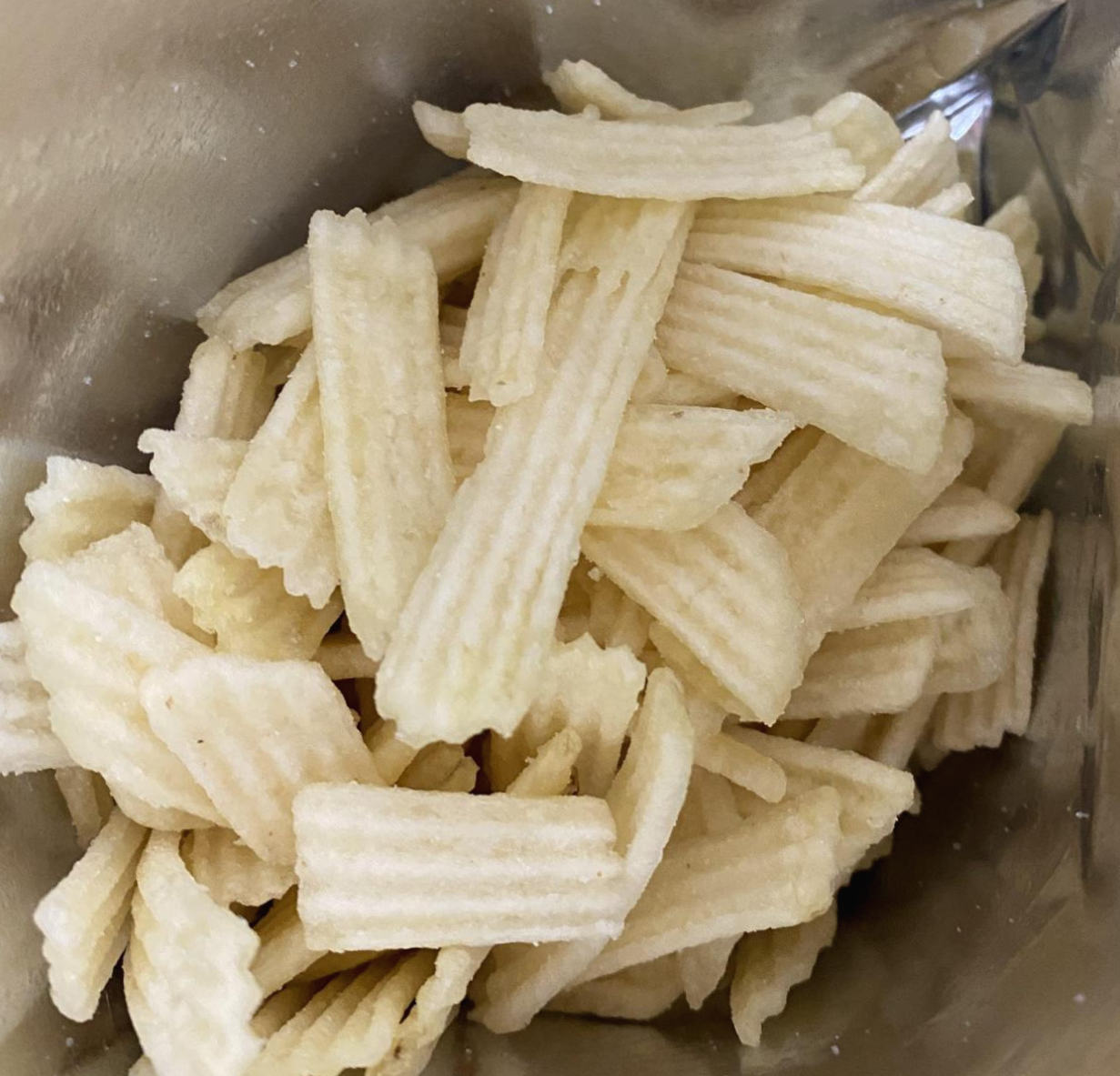 일단 보통 감자칩 하면 감자를 얇게 잘라서 동그란 모습을 떠올리는데 이건 그렇지 않다. 직사각형 모양으로 잘라낸 감자에 물결이 치고 있다.