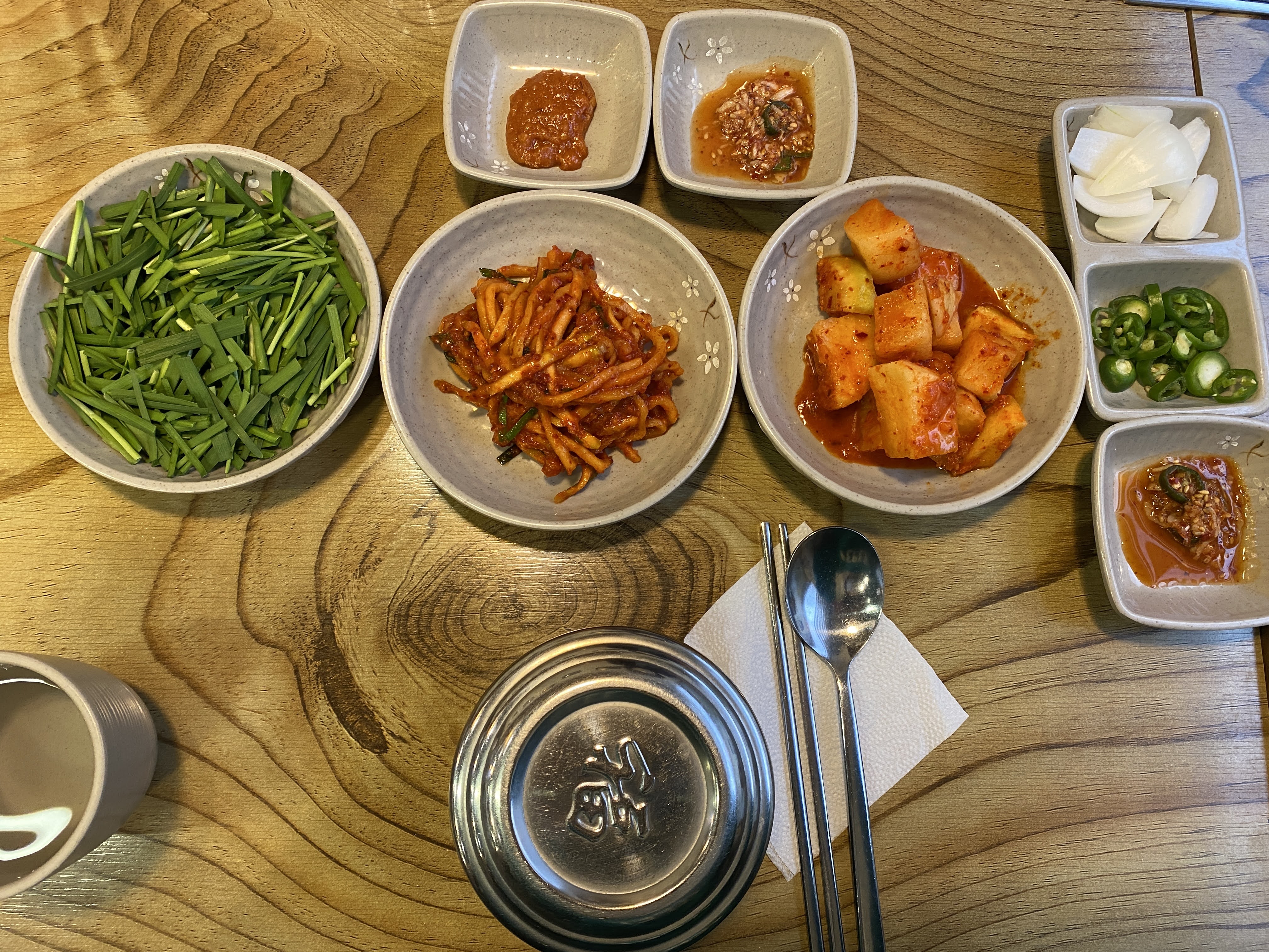 주문하고 식탁에 좌륵 깔린 밑반찬. 싱싱한 부추랑 맛깔스러운 김치. 취향껏 곁들이라고 주신 마늘과 고추, 새우젓. 안 나왔지만 양념장과 들깨, 후추도 한쪽에 마련되어 있었다.