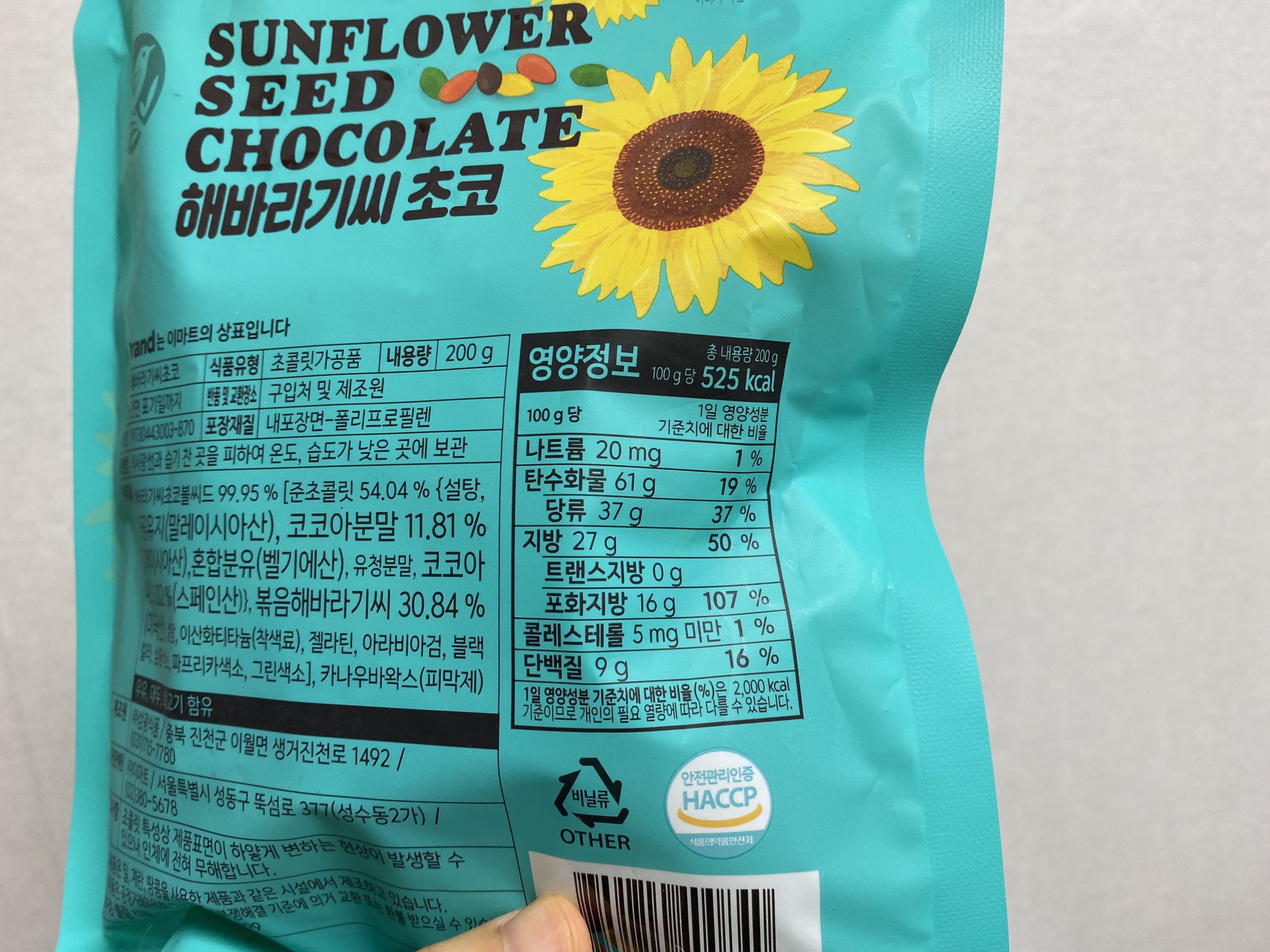 역시 해바라기씨 초코볼은 좀 이렇게 색도 화려해야 한다. 삼각 포장이 의외로 잘 안 찢어져서 뜯기 좀 힘들었다.