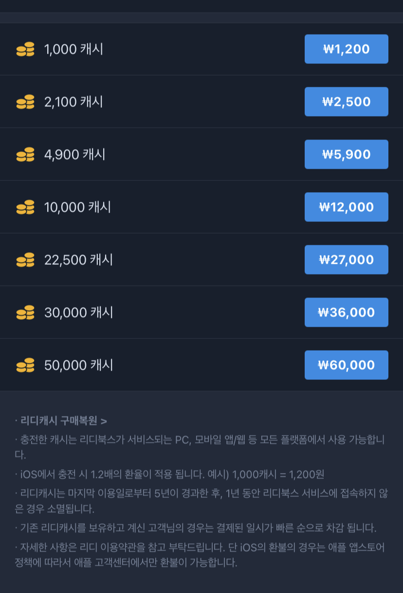 다행이랄지 리디는 늘 웹에서 충전을 했는데 시리즈는..시리즈는...카카오페이지는 구독형이나 자동충전형만 앱에서 가능하고, 지정금액 충전은 웹에서만 가능하게 아예 막아 버렸다.