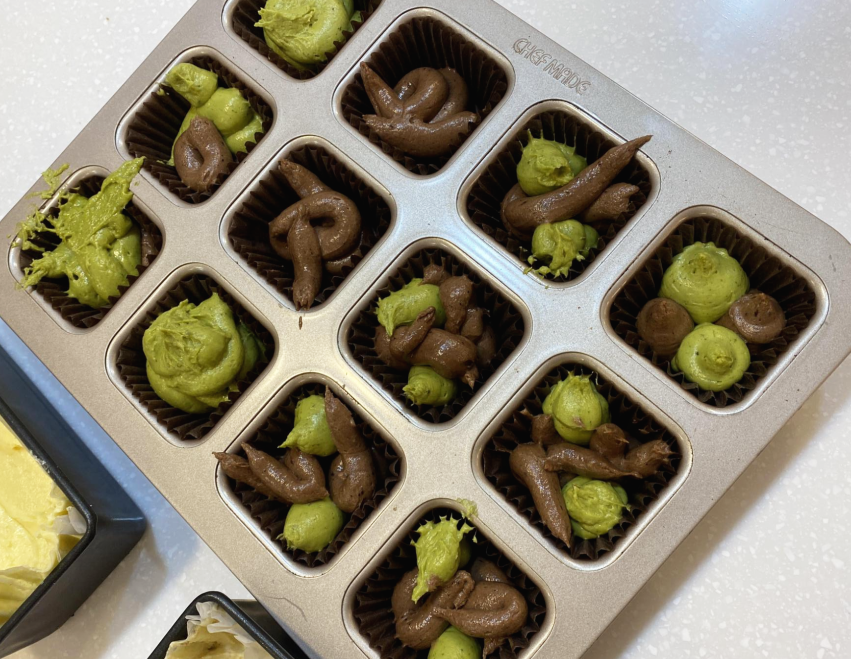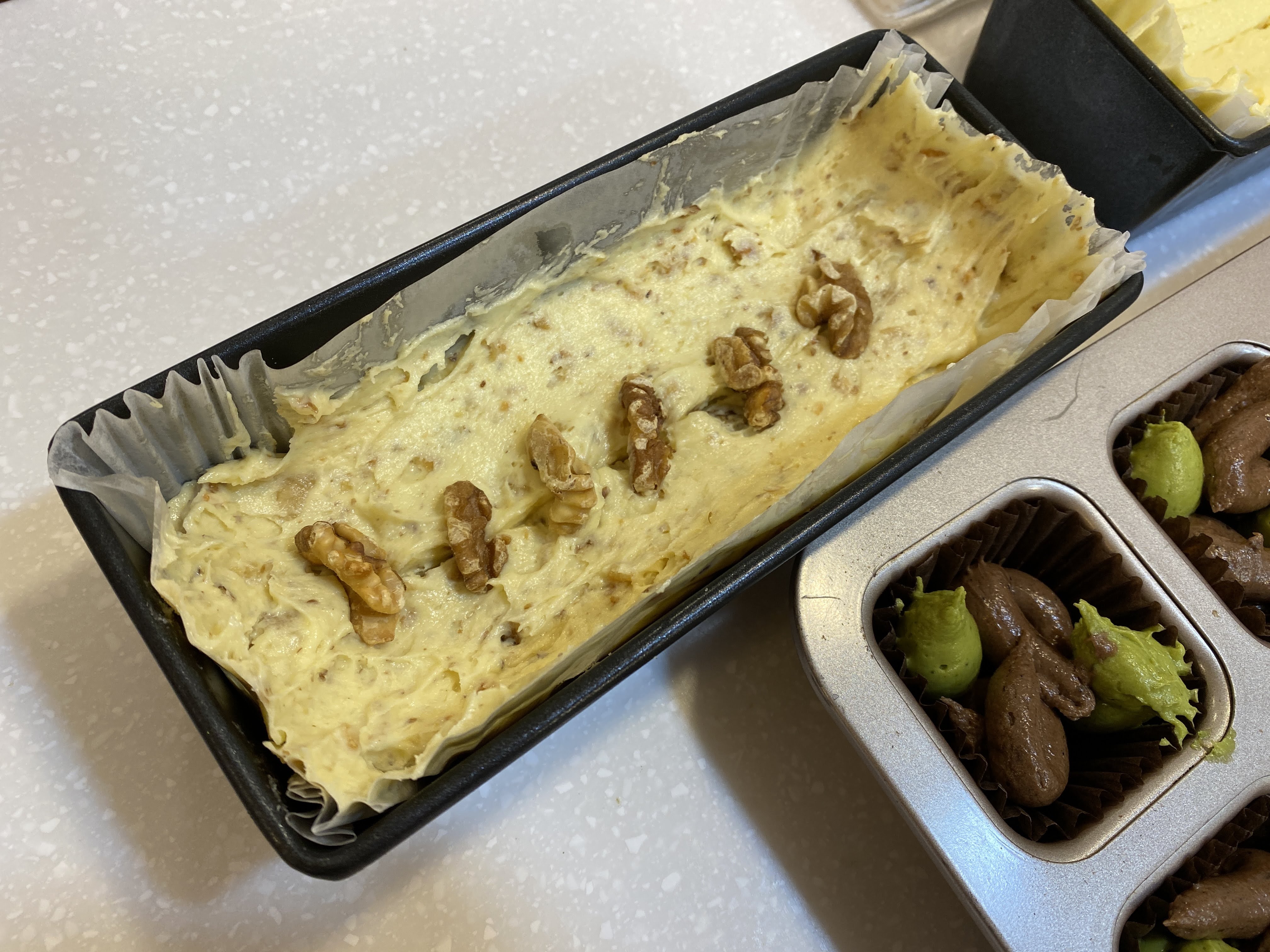 호두랑 플레인은 파운드 케이크로 굽고 초코랑 녹차 반죽은 짤 주머니에 넣어서 머핀 틀에 쭉쭉. 머핀 틀에 예쁘게 짜는 게 굉장히 어려웠다. 어떻게 짜도 이것은...이것은...........이렇게 짜 놓고 나니 모양은 포기해야겠구나 싶었다.